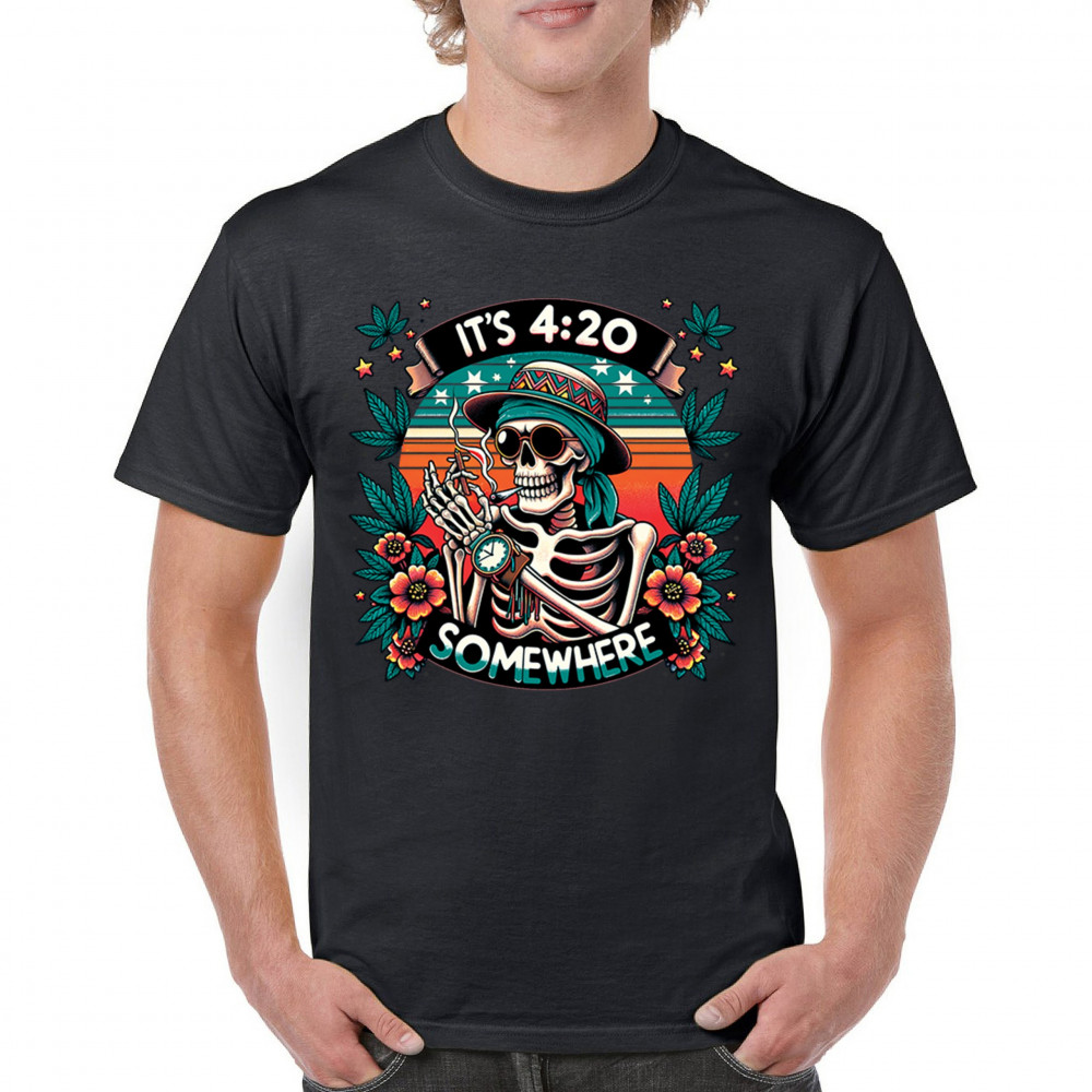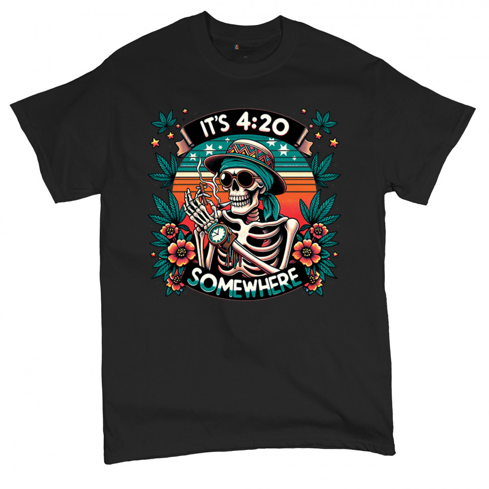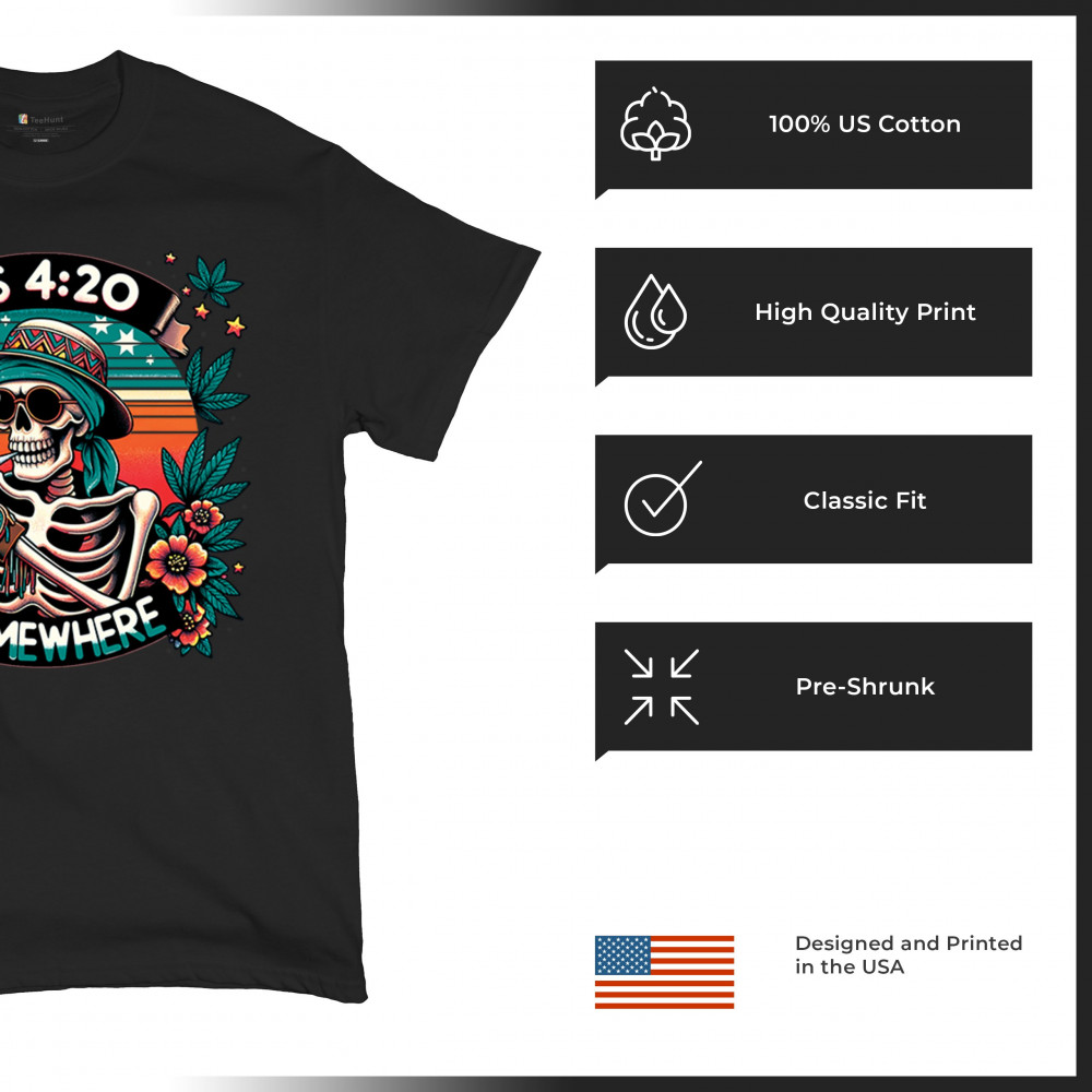 Get lifted with this “It’s 4:20 Somewhere†design featuring a joint-smoking skeleton, tropical sunset, and Deadhead stoner vibes. With bold trippy colors and beachy weed art, this tee is perfect for April 20 parties, summer festivals, and cannabis lovers living the high life.
