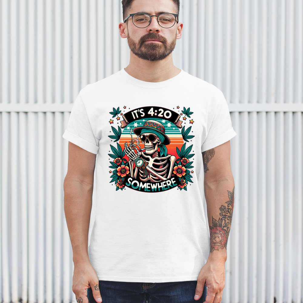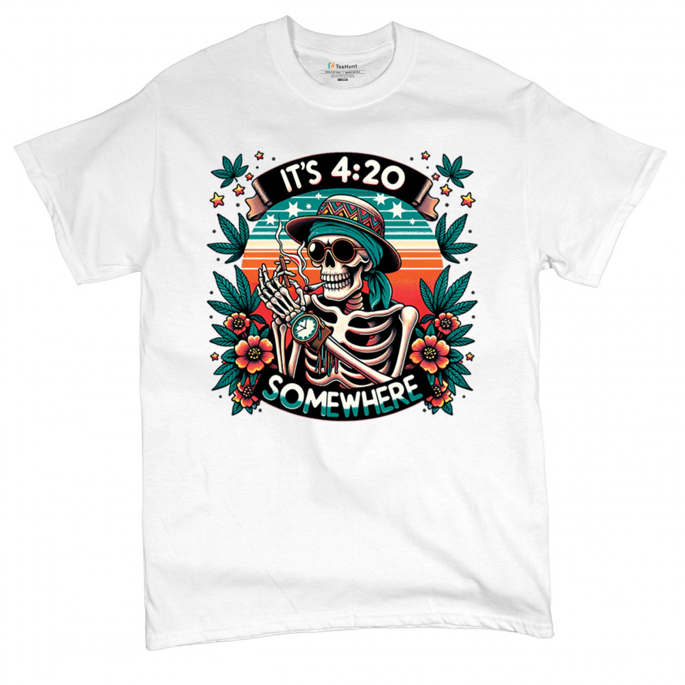 Get lifted with this “It’s 4:20 Somewhere†design featuring a joint-smoking skeleton, tropical sunset, and Deadhead stoner vibes. With bold trippy colors and beachy weed art, this tee is perfect for April 20 parties, summer festivals, and cannabis lovers living the high life.