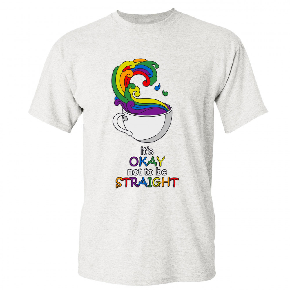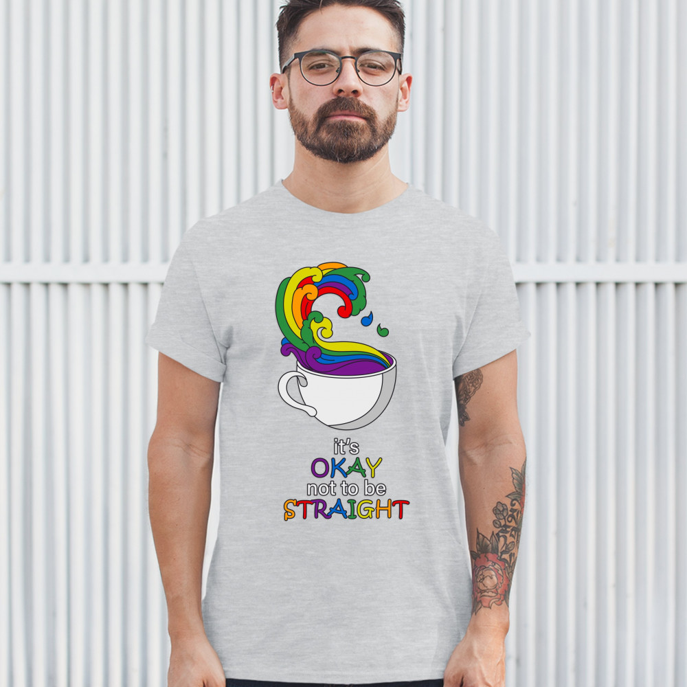 A print saying: "it's okay not to be straight" and featuring a cup with rainbow liquid pouring out of it. Great choice to wear as a proud queer person.