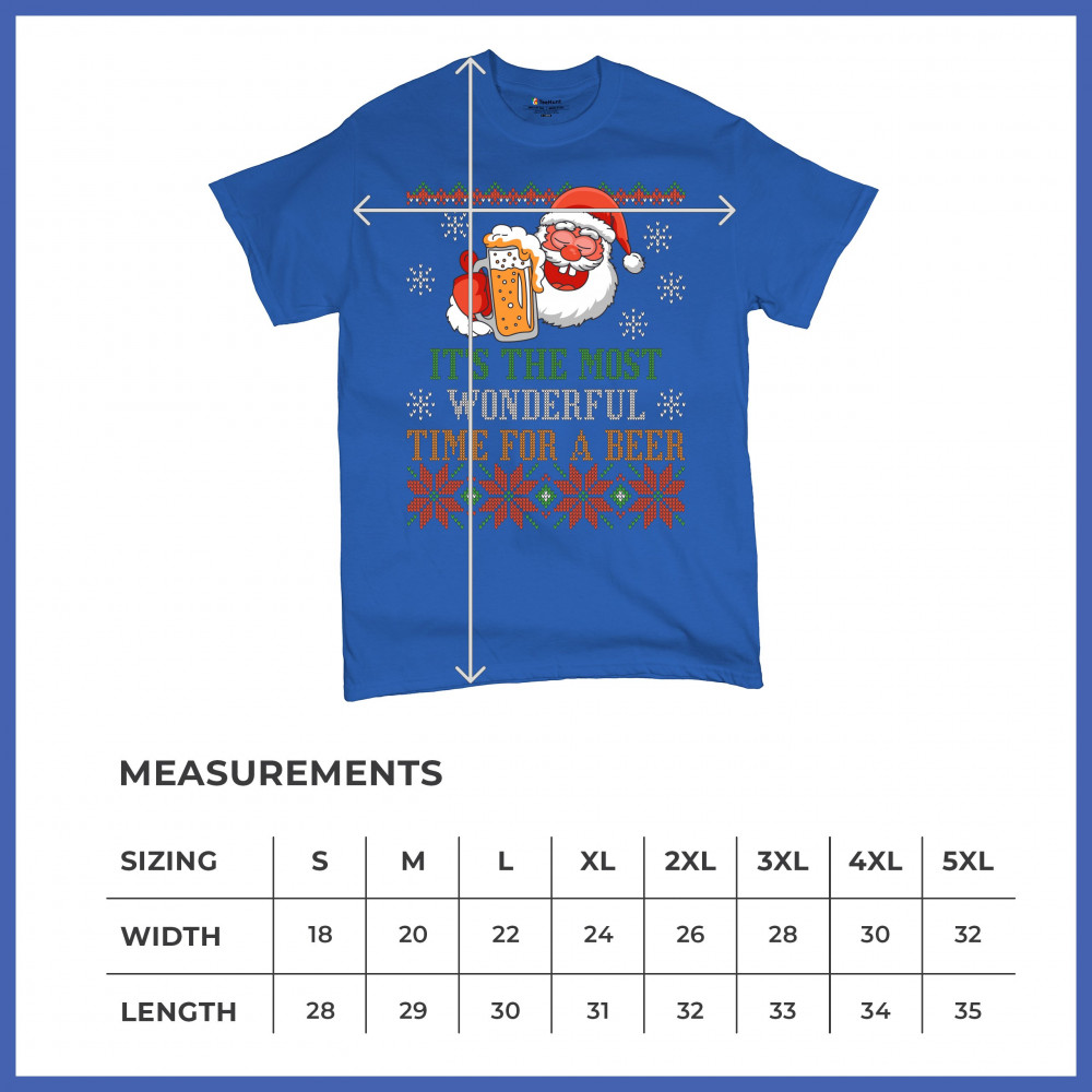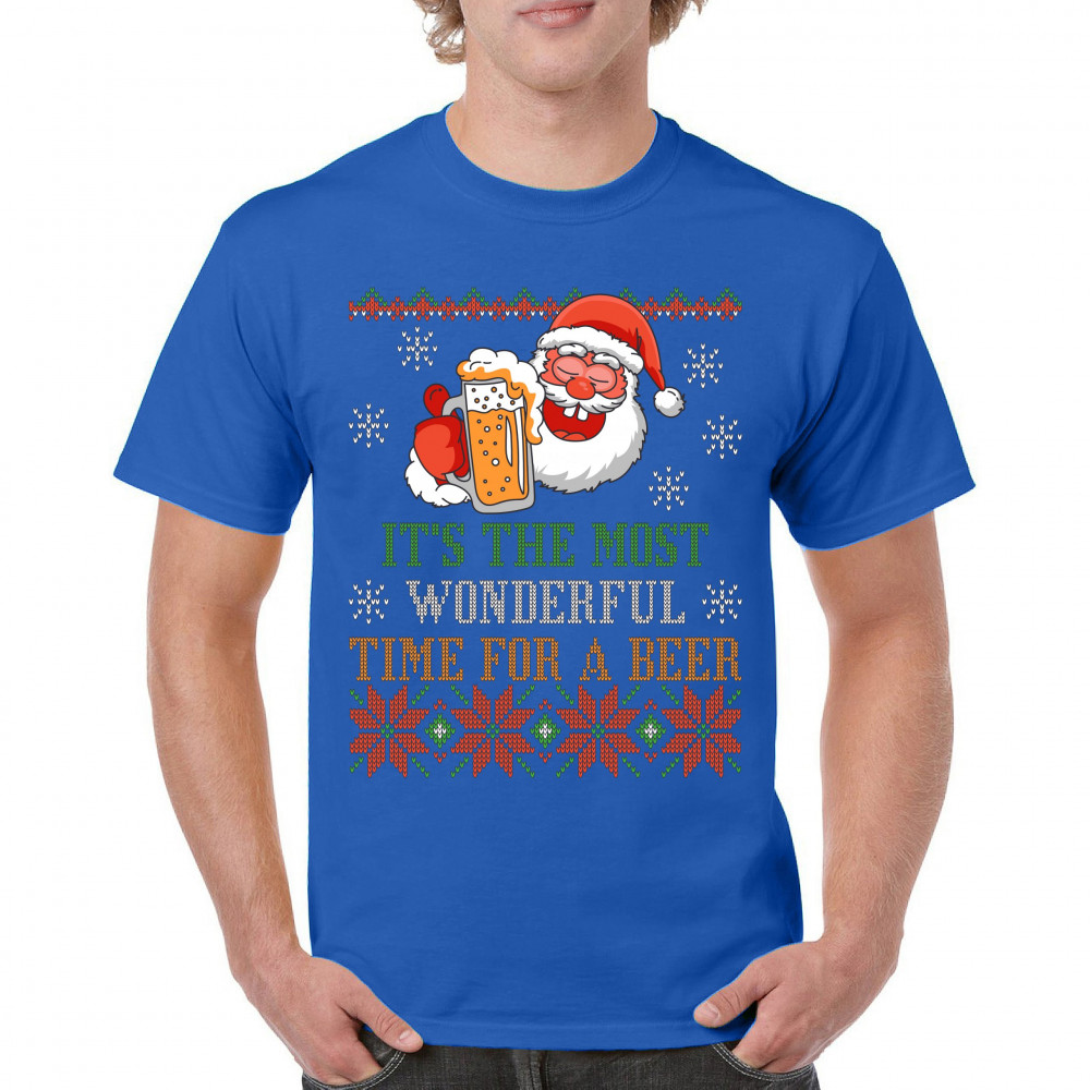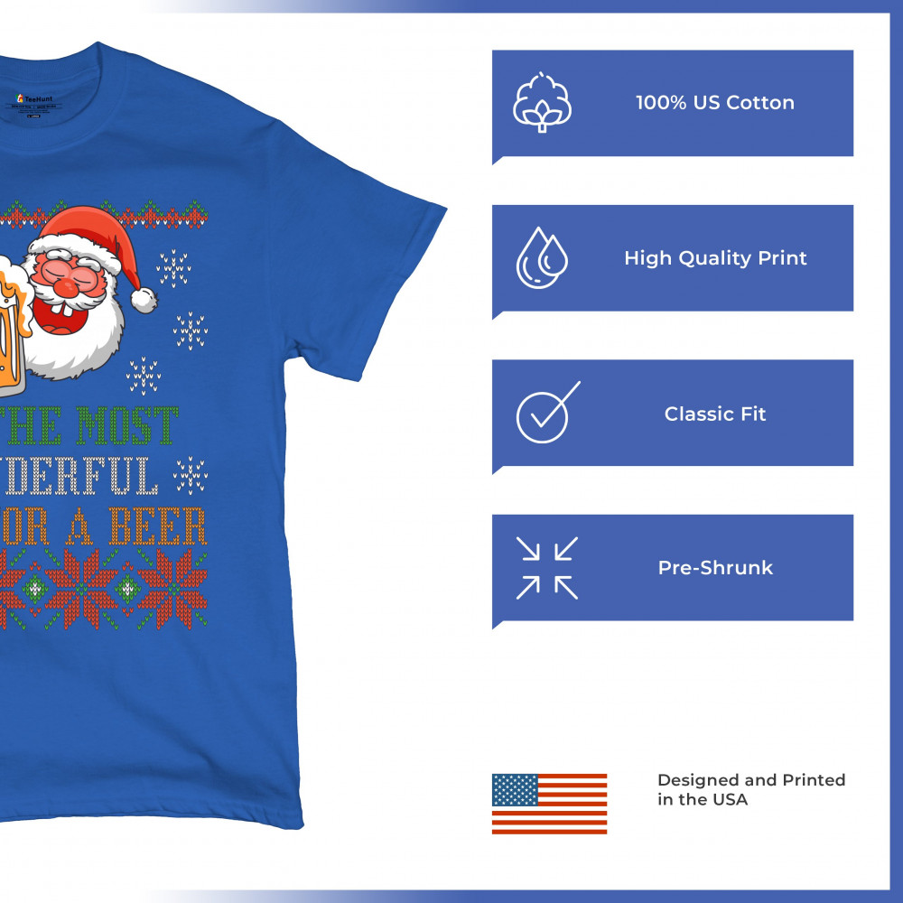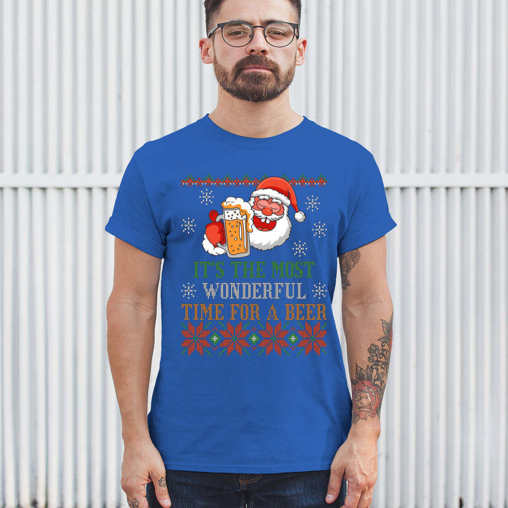 A print saying: "It's the Most Wonderful Time for a Beer" and featuring Santa Claus holding a glass of beer. The print is designed as an ugly sweater. Amazing choice for a single person who wants to make people smile and spread positive vibes on Christmas