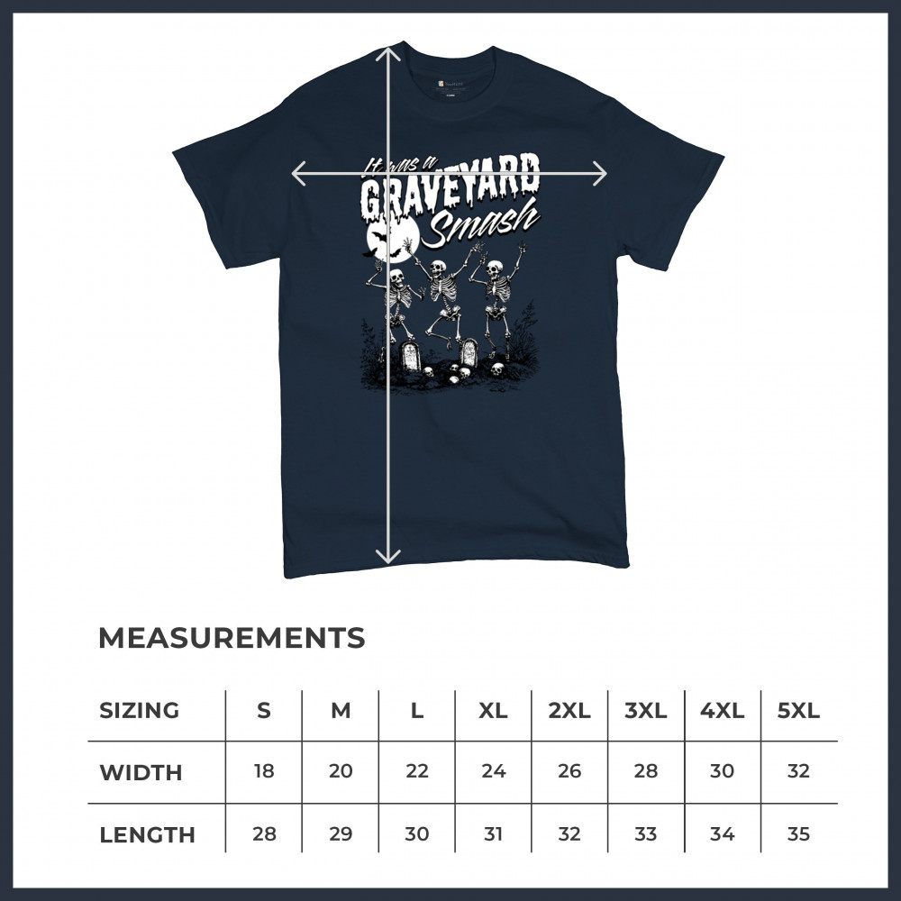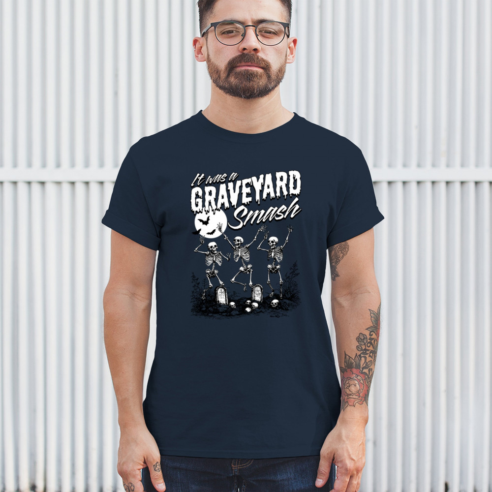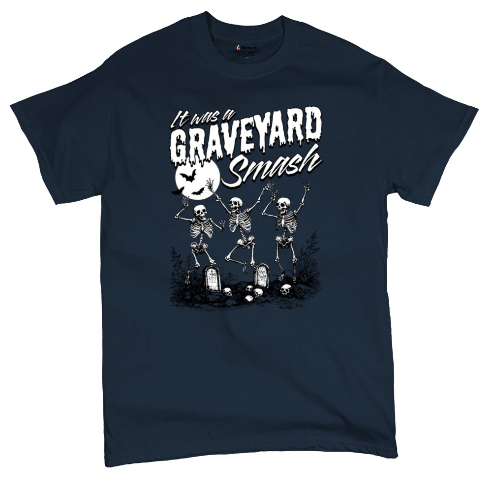 Add a touch of spooky fun to your Halloween attire with this "Graveyard Smash" design, showcasing skeletons dancing under the moonlight in a graveyard. Ideal for anyone who loves Halloween, this graphic tee is perfect for parties, haunted houses, or casual trick-or-treating. Made from high-quality materials, it offers both comfort and style, ensuring you look great while embracing the festive spirit. Available in multiple sizes, this shirt is a must-have for your Halloween collection.