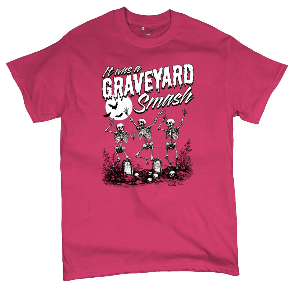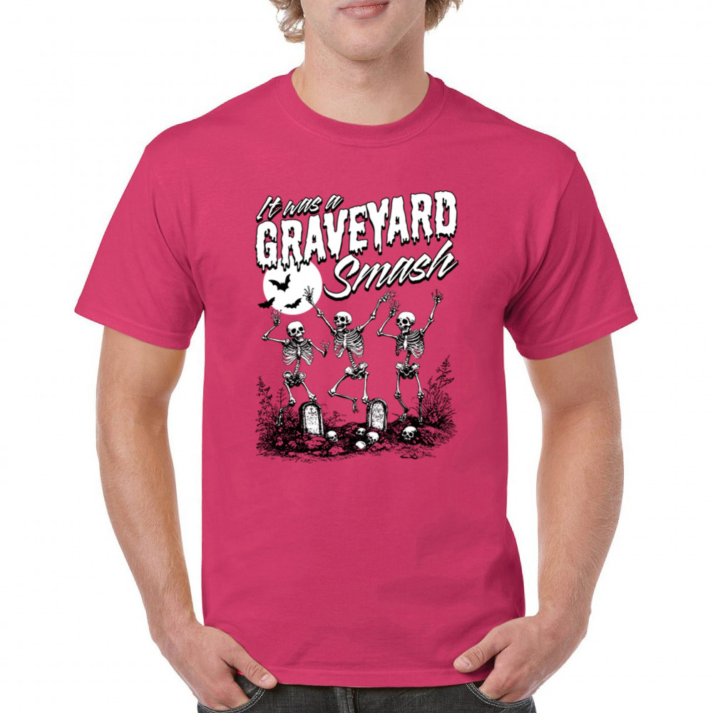 Add a touch of spooky fun to your Halloween attire with this "Graveyard Smash" design, showcasing skeletons dancing under the moonlight in a graveyard. Ideal for anyone who loves Halloween, this graphic tee is perfect for parties, haunted houses, or casual trick-or-treating. Made from high-quality materials, it offers both comfort and style, ensuring you look great while embracing the festive spirit. Available in multiple sizes, this shirt is a must-have for your Halloween collection.