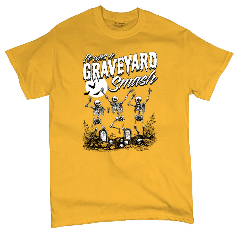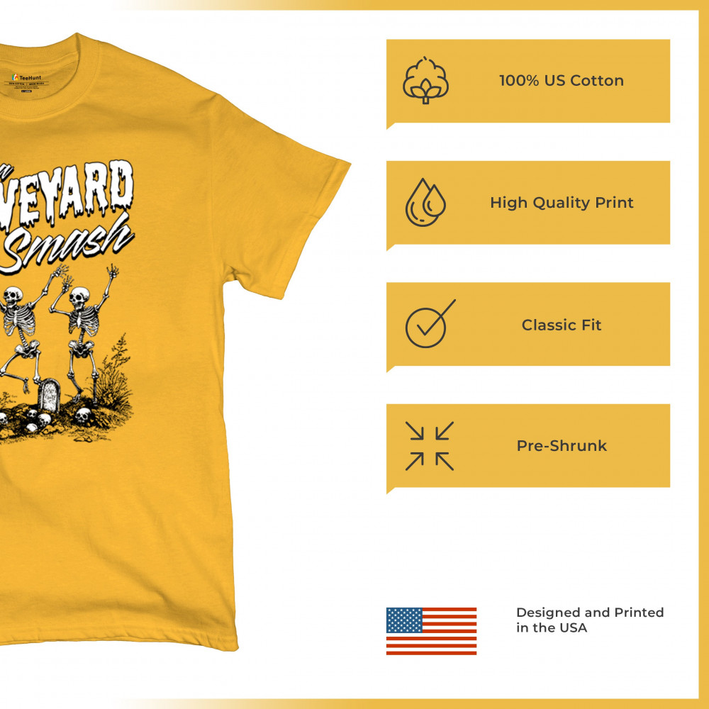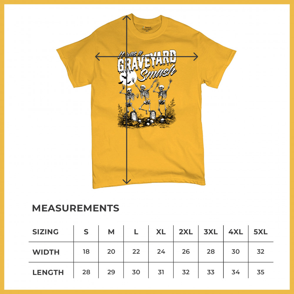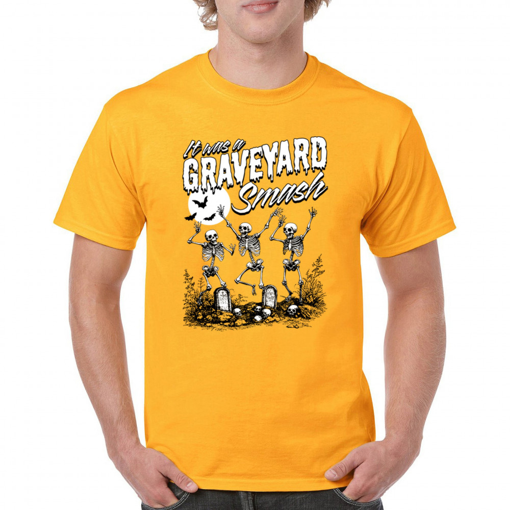 Add a touch of spooky fun to your Halloween attire with this "Graveyard Smash" design, showcasing skeletons dancing under the moonlight in a graveyard. Ideal for anyone who loves Halloween, this graphic tee is perfect for parties, haunted houses, or casual trick-or-treating. Made from high-quality materials, it offers both comfort and style, ensuring you look great while embracing the festive spirit. Available in multiple sizes, this shirt is a must-have for your Halloween collection.