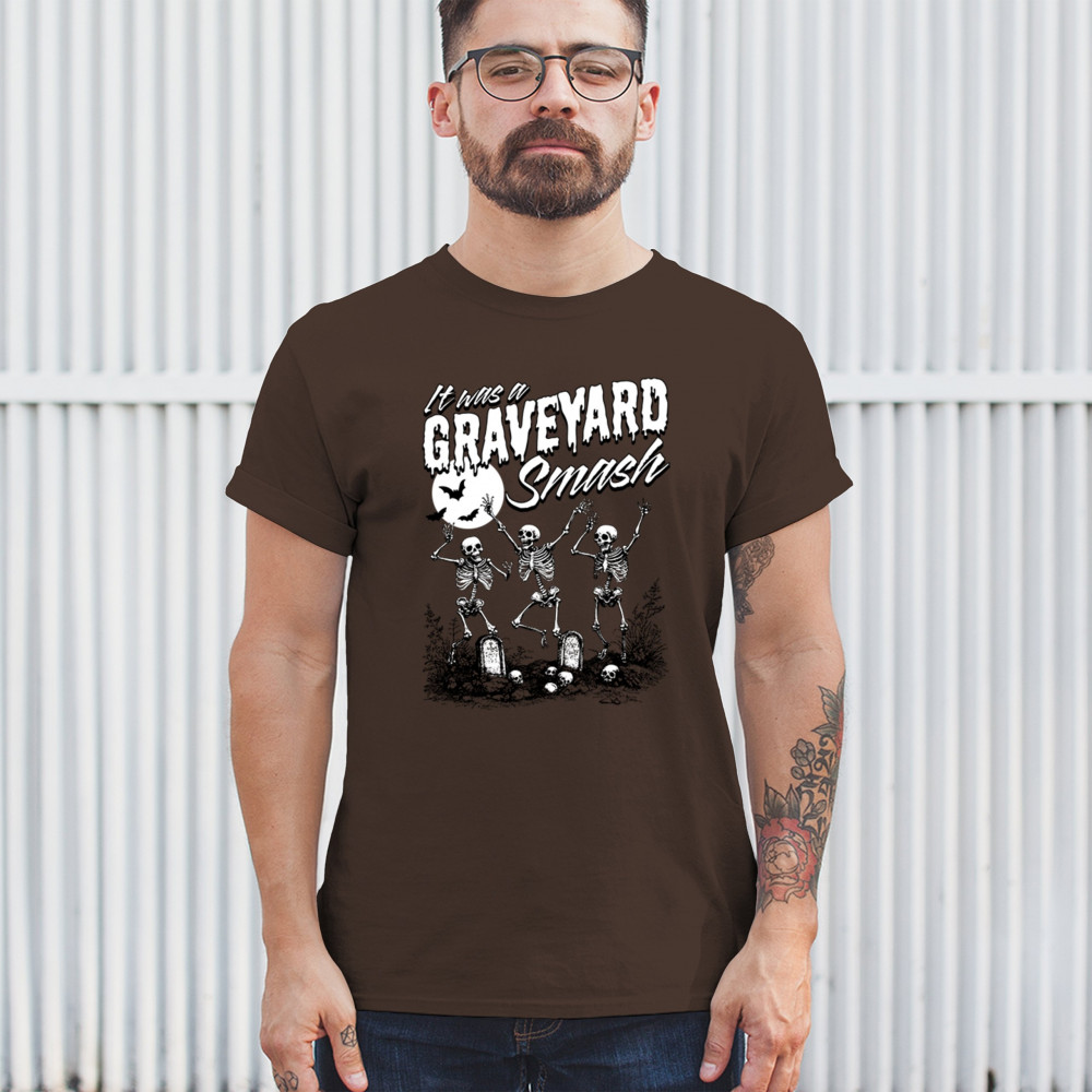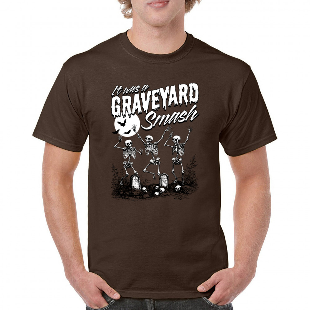 Add a touch of spooky fun to your Halloween attire with this "Graveyard Smash" design, showcasing skeletons dancing under the moonlight in a graveyard. Ideal for anyone who loves Halloween, this graphic tee is perfect for parties, haunted houses, or casual trick-or-treating. Made from high-quality materials, it offers both comfort and style, ensuring you look great while embracing the festive spirit. Available in multiple sizes, this shirt is a must-have for your Halloween collection.