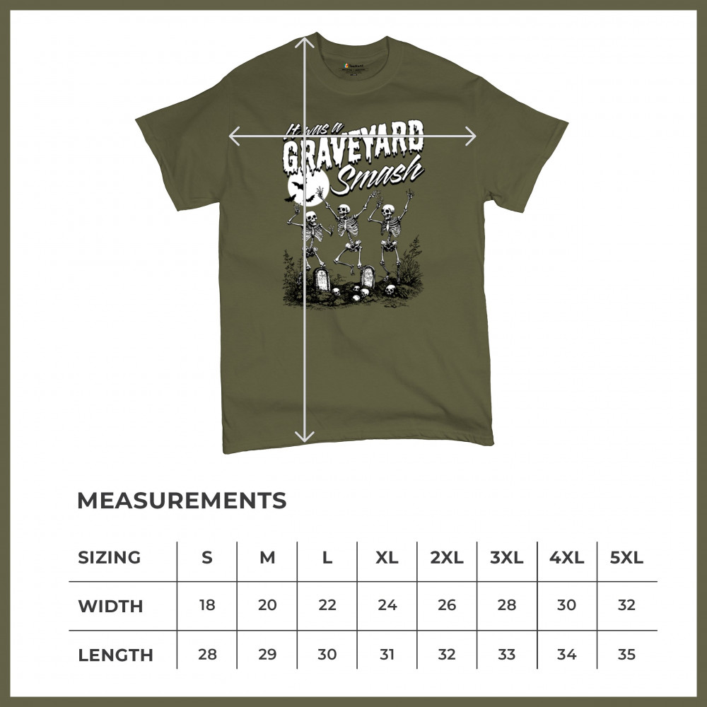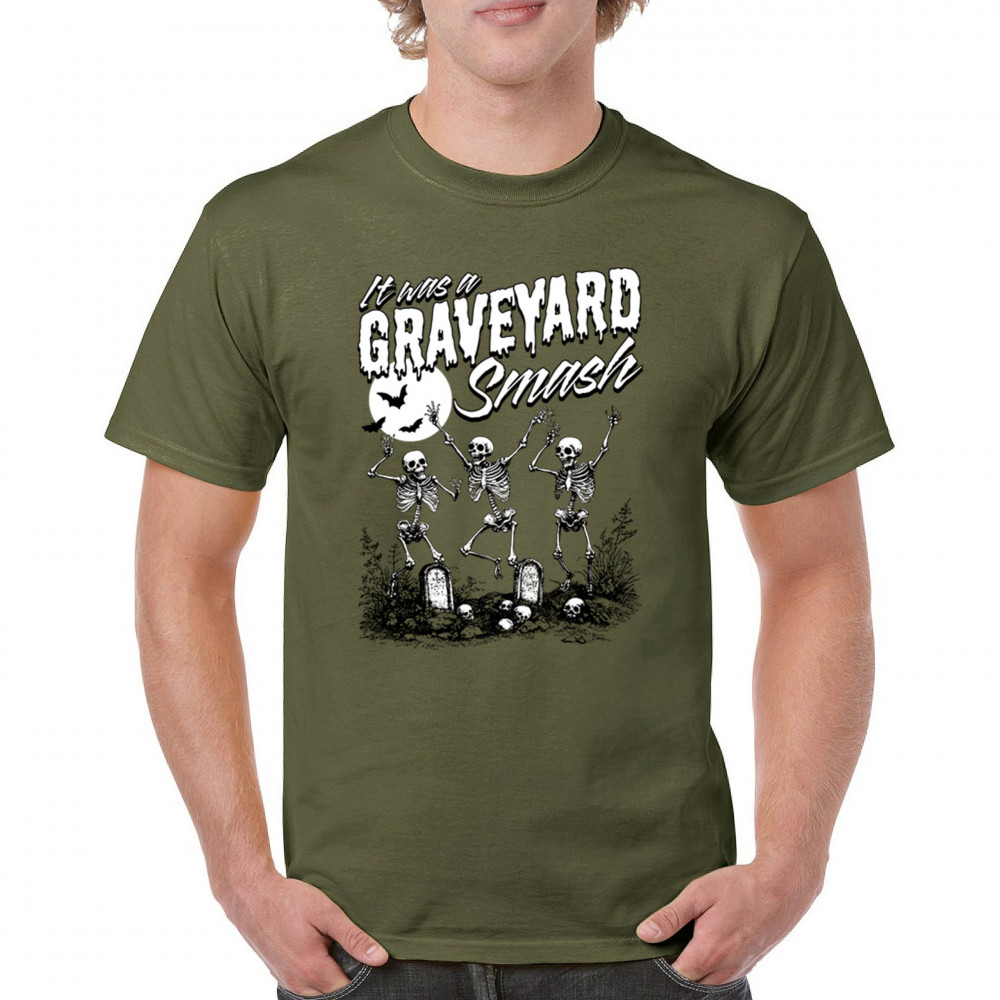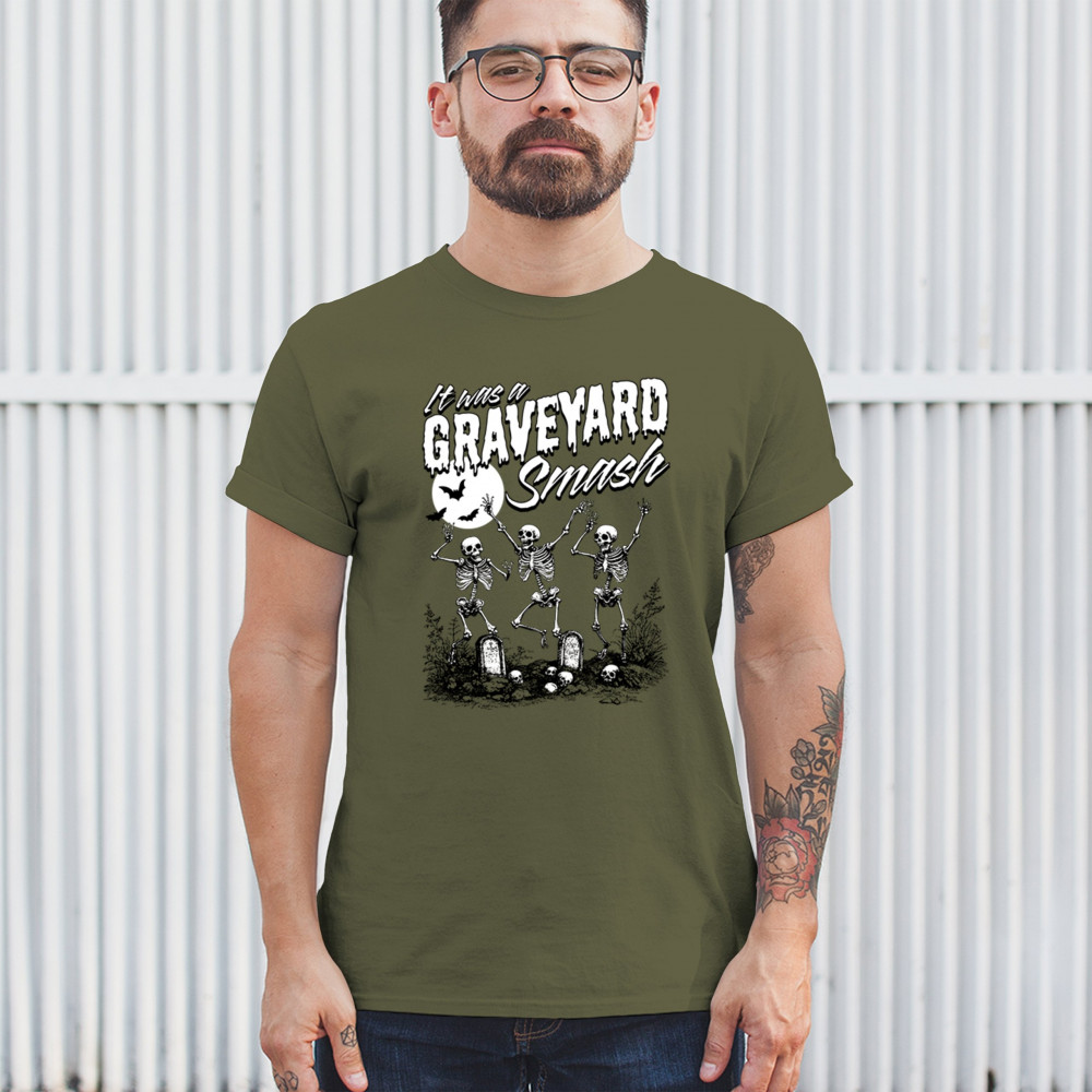 Add a touch of spooky fun to your Halloween attire with this "Graveyard Smash" design, showcasing skeletons dancing under the moonlight in a graveyard. Ideal for anyone who loves Halloween, this graphic tee is perfect for parties, haunted houses, or casual trick-or-treating. Made from high-quality materials, it offers both comfort and style, ensuring you look great while embracing the festive spirit. Available in multiple sizes, this shirt is a must-have for your Halloween collection.