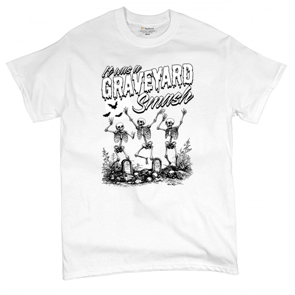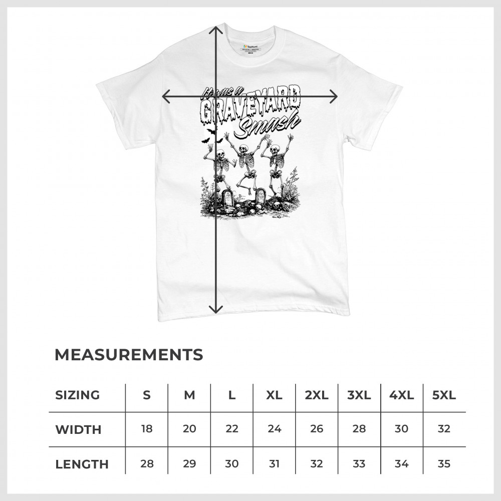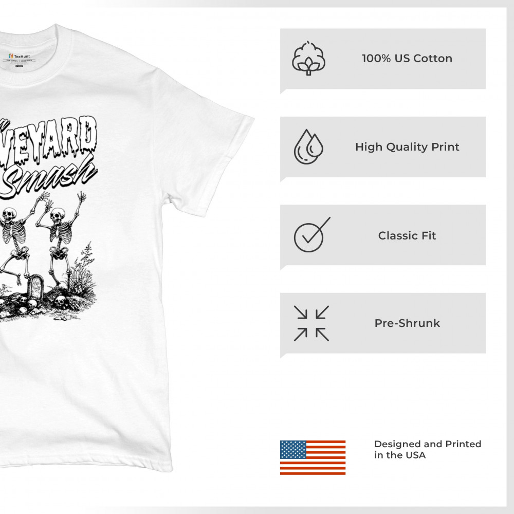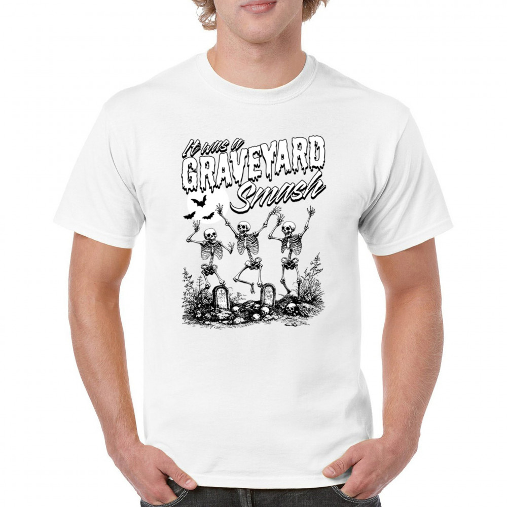 Add a touch of spooky fun to your Halloween attire with this "Graveyard Smash" design, showcasing skeletons dancing under the moonlight in a graveyard. Ideal for anyone who loves Halloween, this graphic tee is perfect for parties, haunted houses, or casual trick-or-treating. Made from high-quality materials, it offers both comfort and style, ensuring you look great while embracing the festive spirit. Available in multiple sizes, this shirt is a must-have for your Halloween collection.