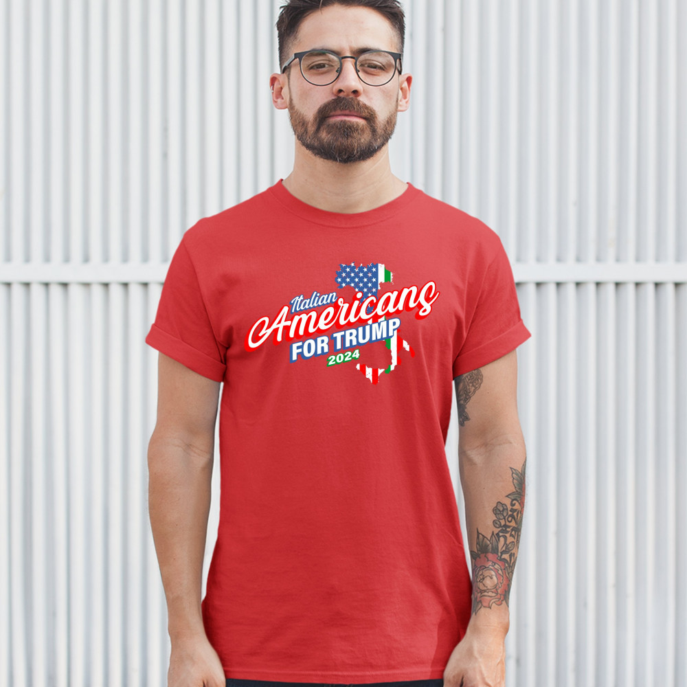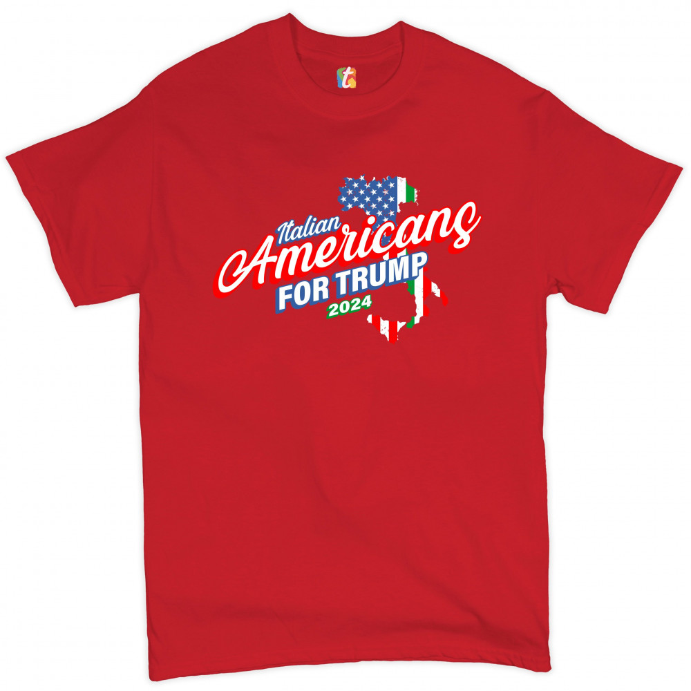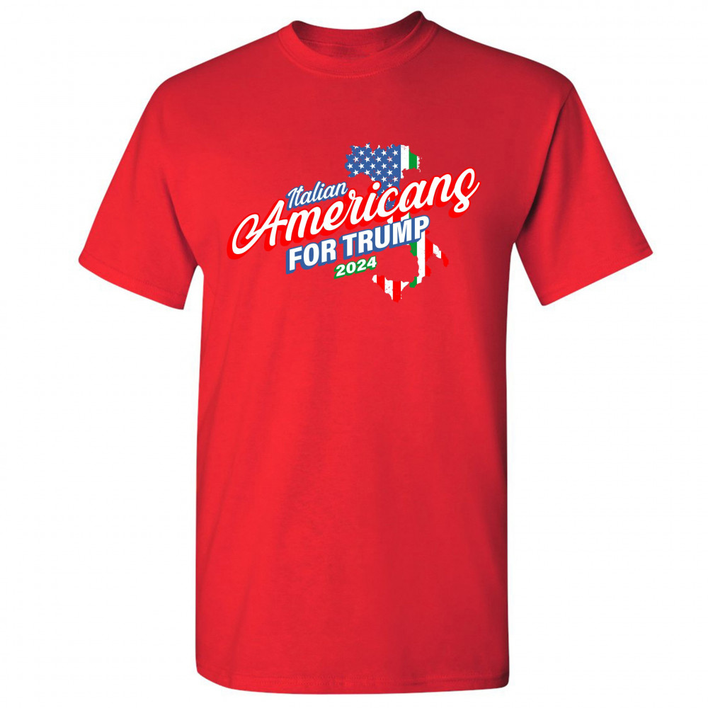 A political print saying "Italian Americans for Trump 2024". The print features a silhouette of Italy in the background with parts of the American and Italian flags inside of it. A great choice to wear for a Trump rally or give as a gift to a Donald Trump