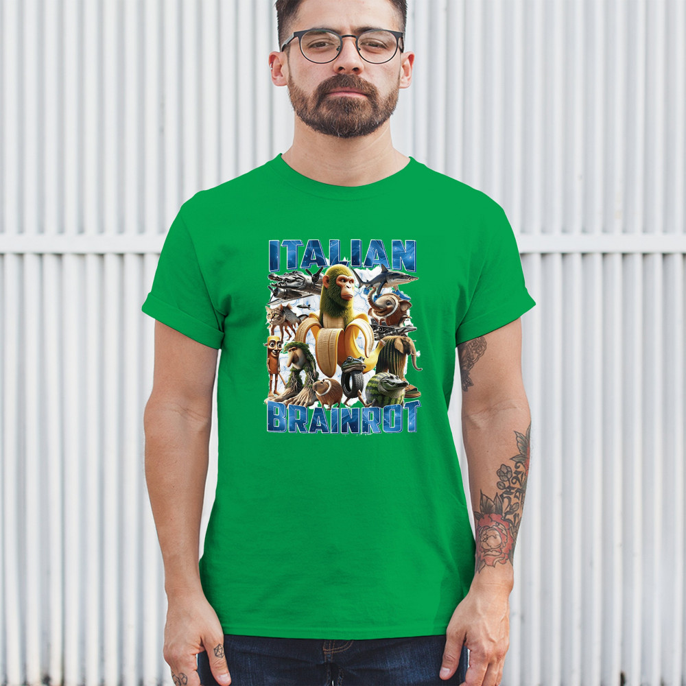 This design captures the full force of Italian brainrot—bananas, sharks, monkeys, and meme beasts collide in an unfiltered internet-core explosion. Perfect for fans of cursed humor, Gen Z trends, absurd fashion, TikTok memes, ironic style, surreal pop art, chaotic culture, digital nonsense, Gen Alpha brainrot, and hyper-online energy.