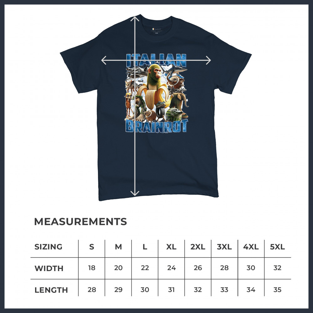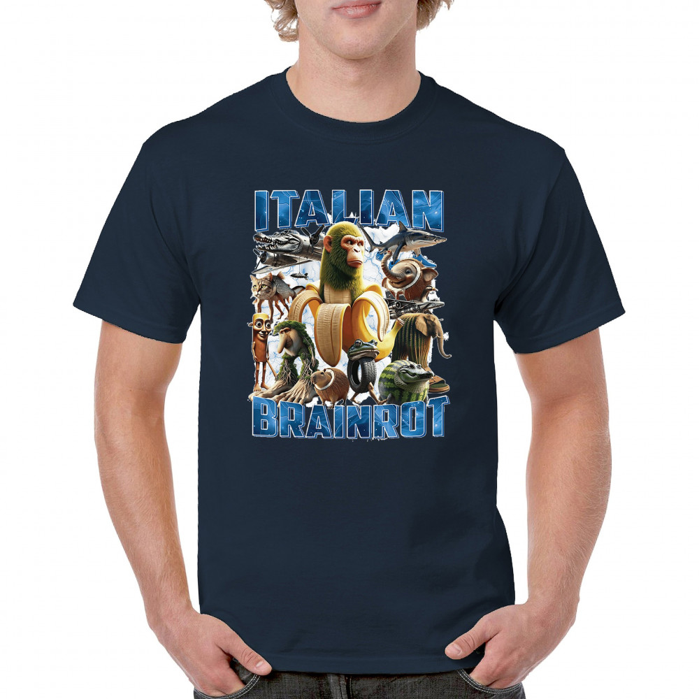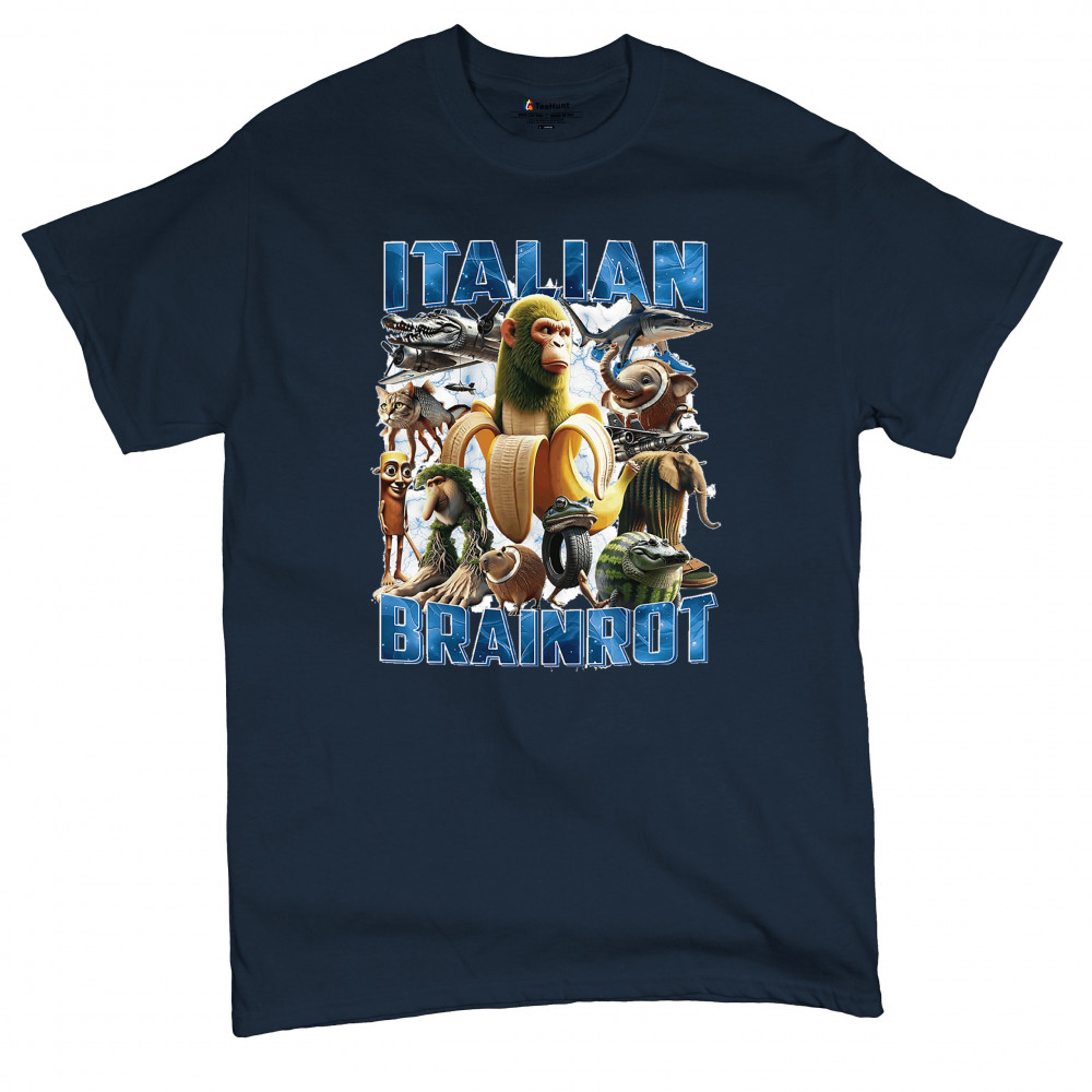 This design captures the full force of Italian brainrot—bananas, sharks, monkeys, and meme beasts collide in an unfiltered internet-core explosion. Perfect for fans of cursed humor, Gen Z trends, absurd fashion, TikTok memes, ironic style, surreal pop art, chaotic culture, digital nonsense, Gen Alpha brainrot, and hyper-online energy.