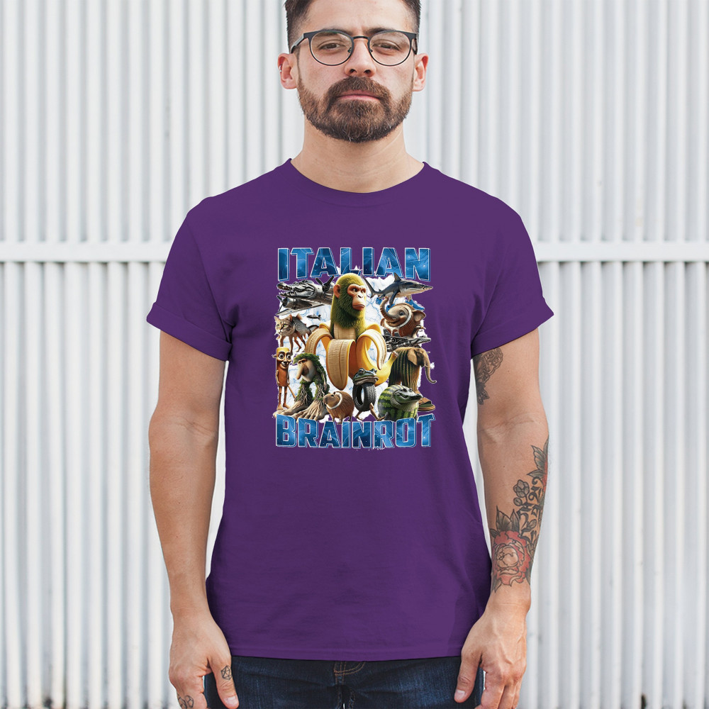 This design captures the full force of Italian brainrot—bananas, sharks, monkeys, and meme beasts collide in an unfiltered internet-core explosion. Perfect for fans of cursed humor, Gen Z trends, absurd fashion, TikTok memes, ironic style, surreal pop art, chaotic culture, digital nonsense, Gen Alpha brainrot, and hyper-online energy.