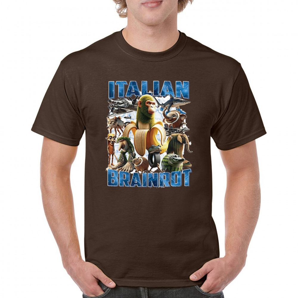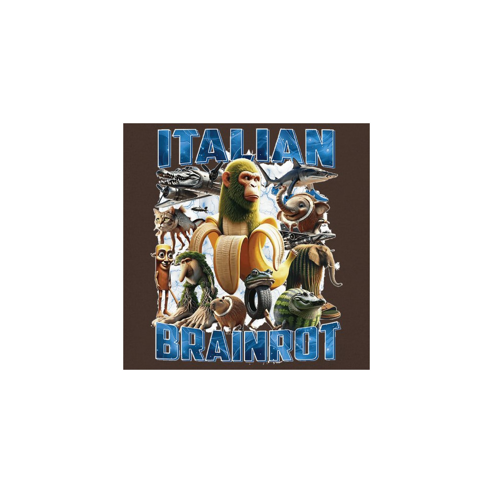 This design captures the full force of Italian brainrot—bananas, sharks, monkeys, and meme beasts collide in an unfiltered internet-core explosion. Perfect for fans of cursed humor, Gen Z trends, absurd fashion, TikTok memes, ironic style, surreal pop art, chaotic culture, digital nonsense, Gen Alpha brainrot, and hyper-online energy.