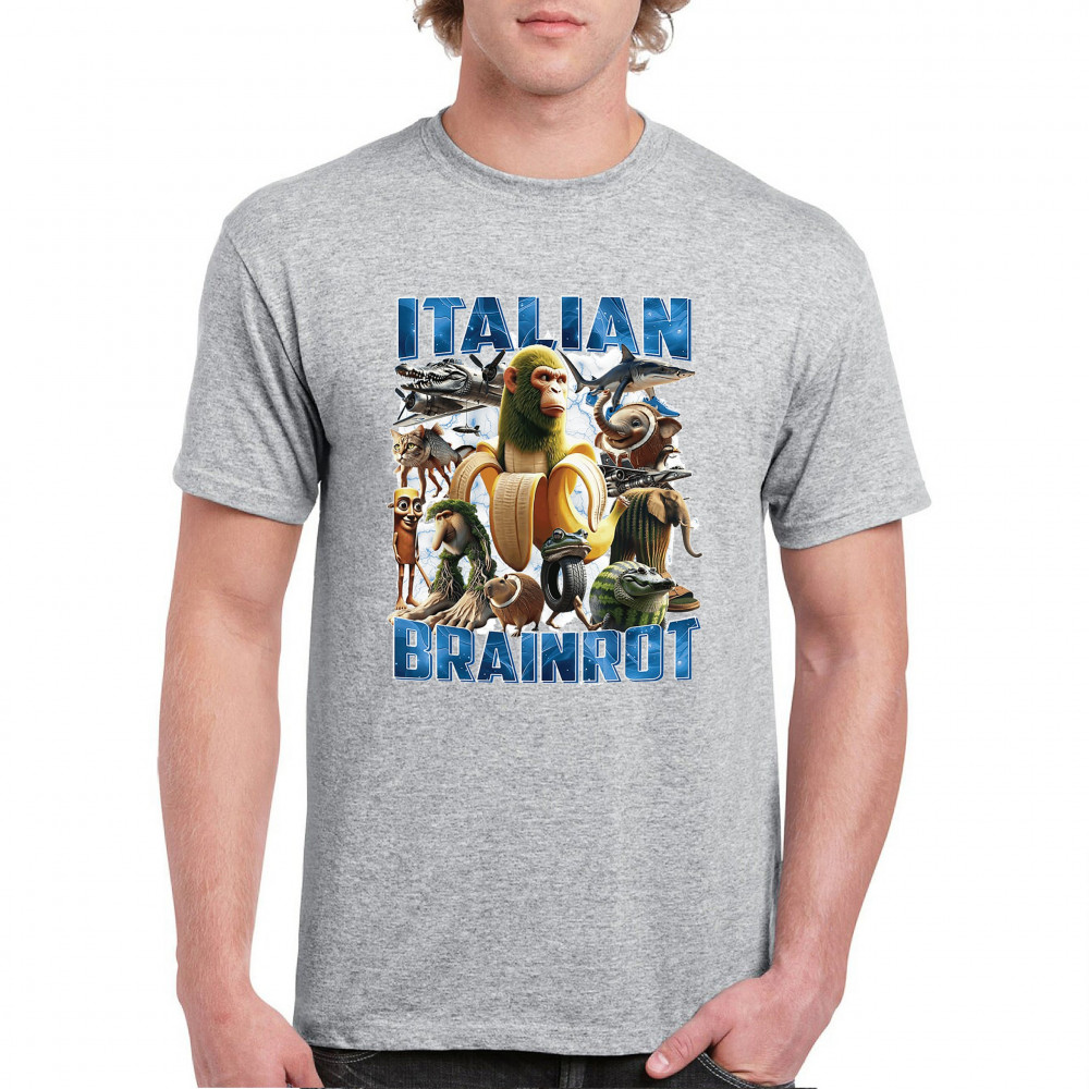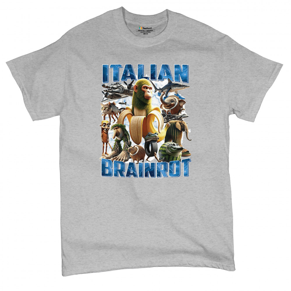 This design captures the full force of Italian brainrot—bananas, sharks, monkeys, and meme beasts collide in an unfiltered internet-core explosion. Perfect for fans of cursed humor, Gen Z trends, absurd fashion, TikTok memes, ironic style, surreal pop art, chaotic culture, digital nonsense, Gen Alpha brainrot, and hyper-online energy.