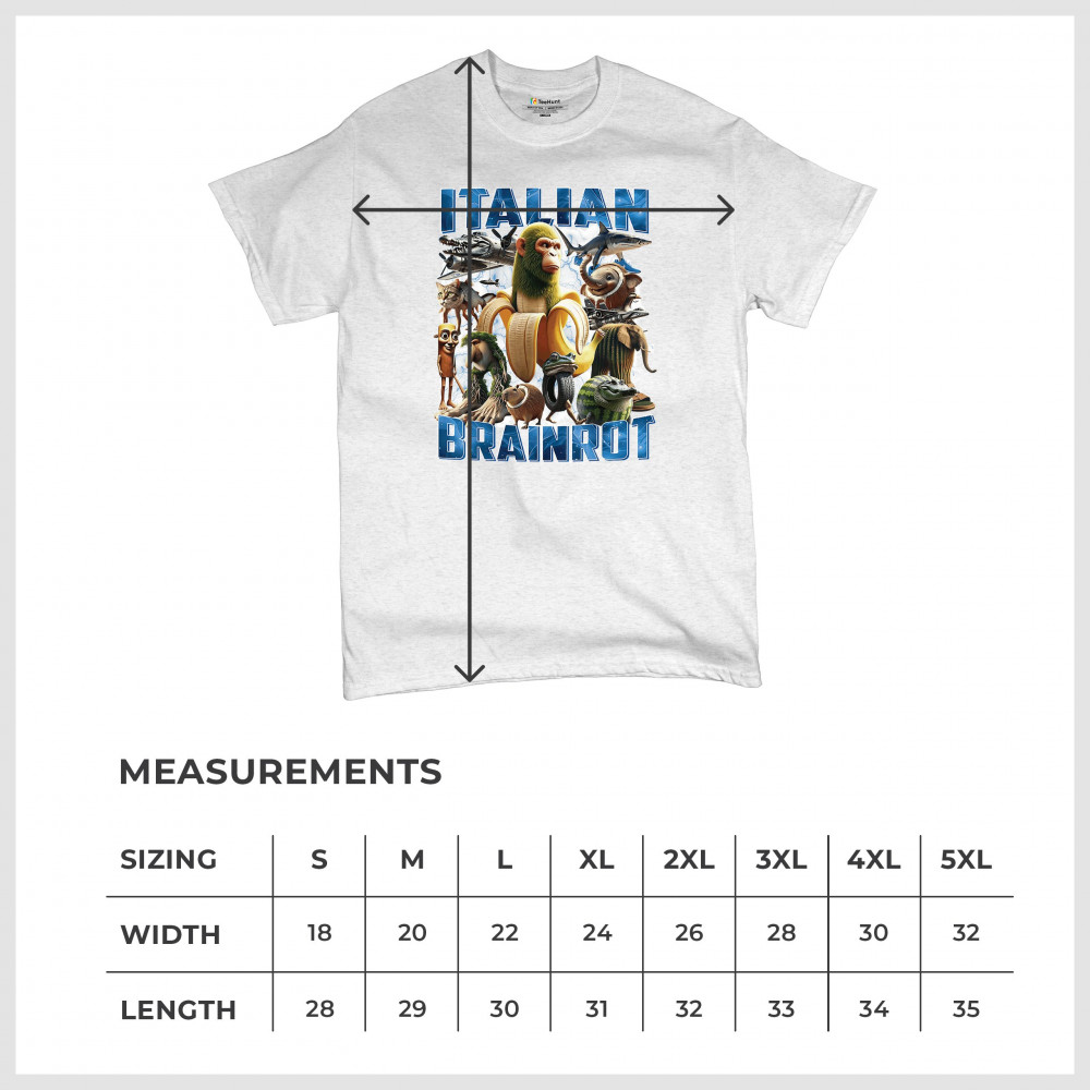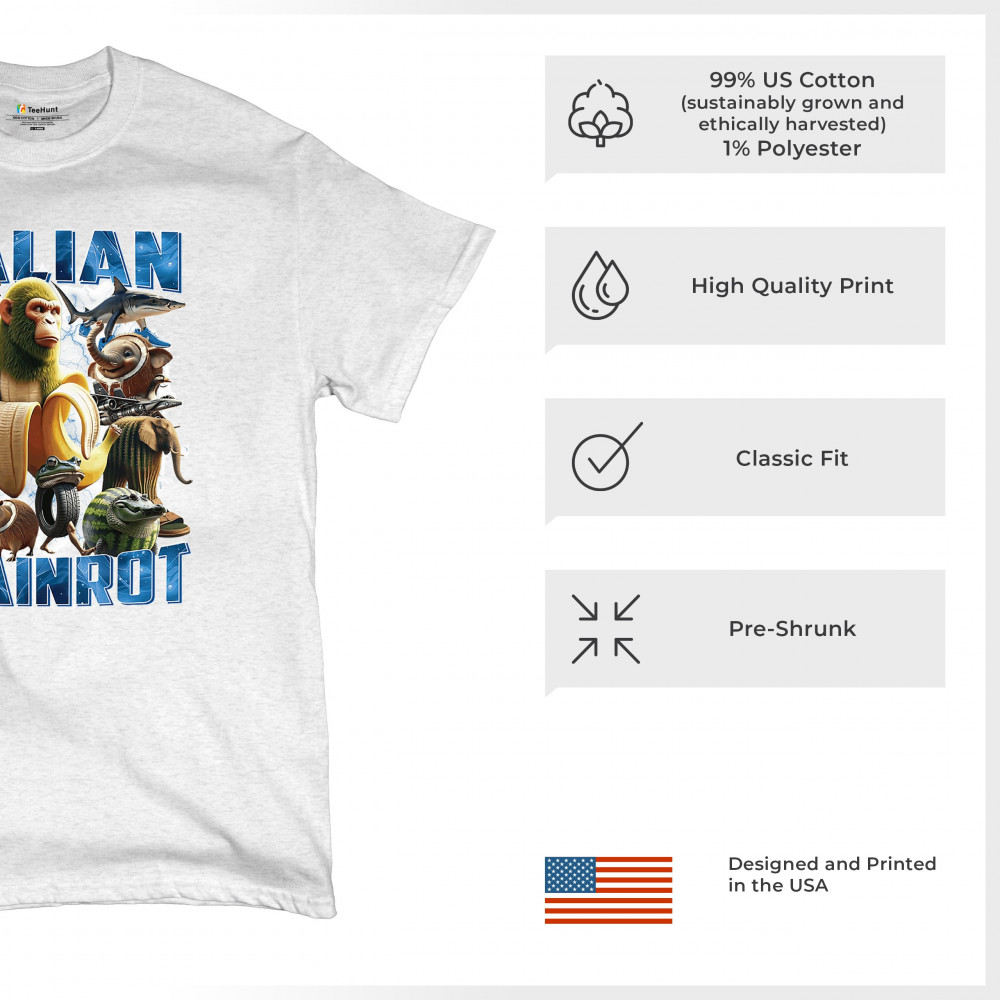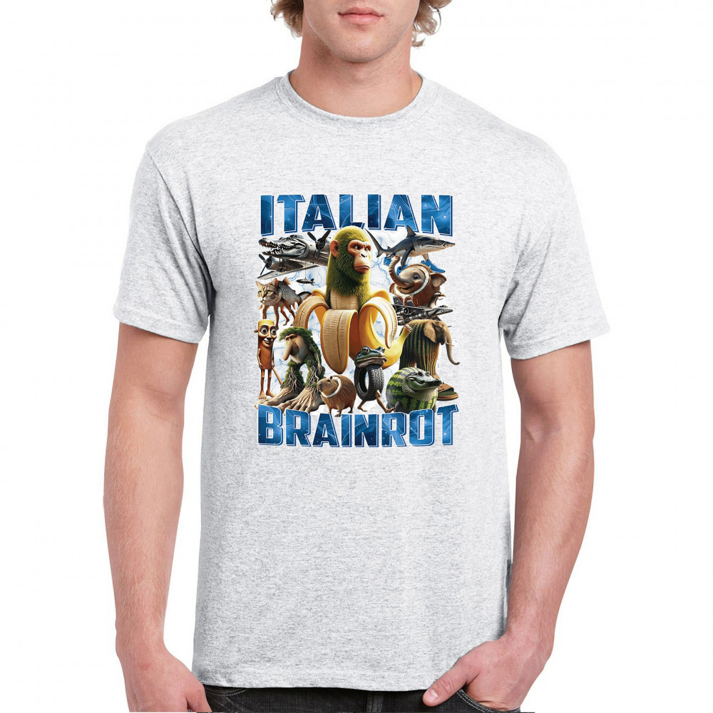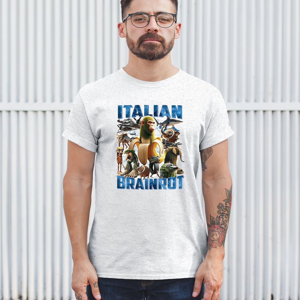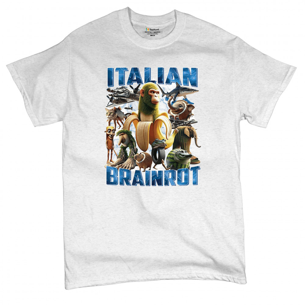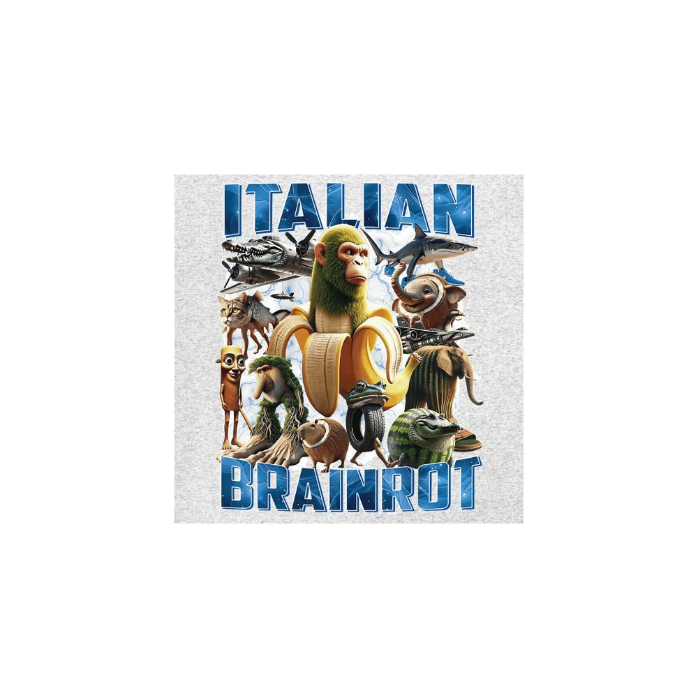 This design captures the full force of Italian brainrot—bananas, sharks, monkeys, and meme beasts collide in an unfiltered internet-core explosion. Perfect for fans of cursed humor, Gen Z trends, absurd fashion, TikTok memes, ironic style, surreal pop art, chaotic culture, digital nonsense, Gen Alpha brainrot, and hyper-online energy.