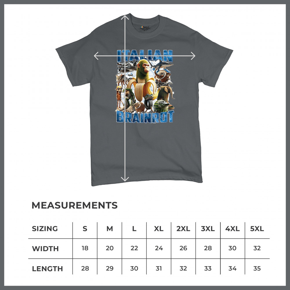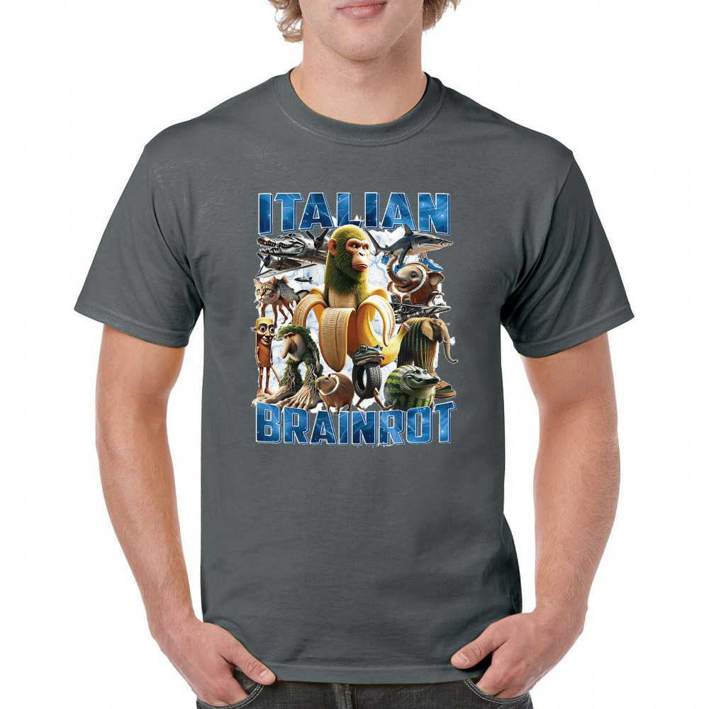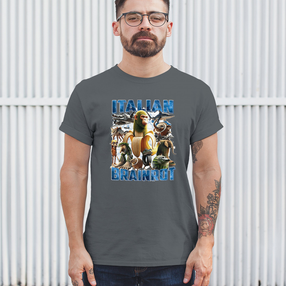 This design captures the full force of Italian brainrot—bananas, sharks, monkeys, and meme beasts collide in an unfiltered internet-core explosion. Perfect for fans of cursed humor, Gen Z trends, absurd fashion, TikTok memes, ironic style, surreal pop art, chaotic culture, digital nonsense, Gen Alpha brainrot, and hyper-online energy.