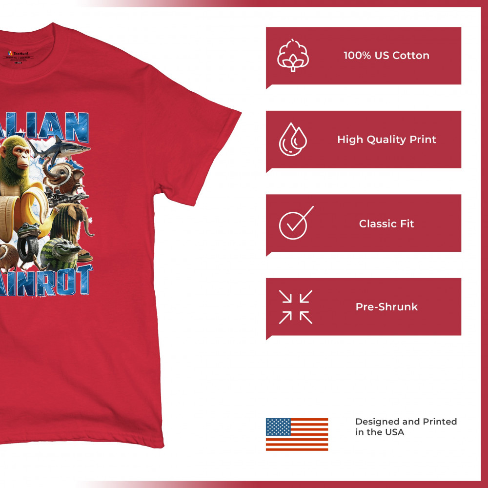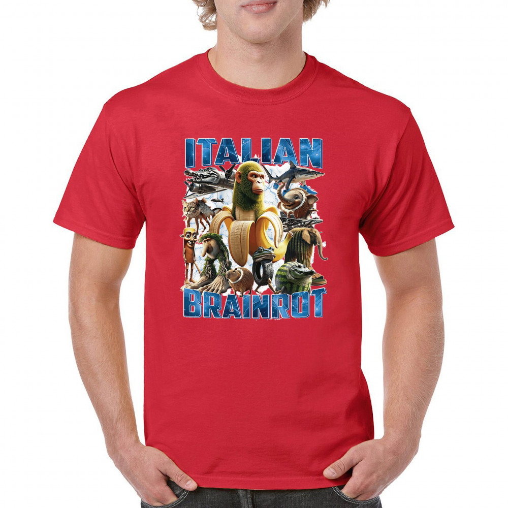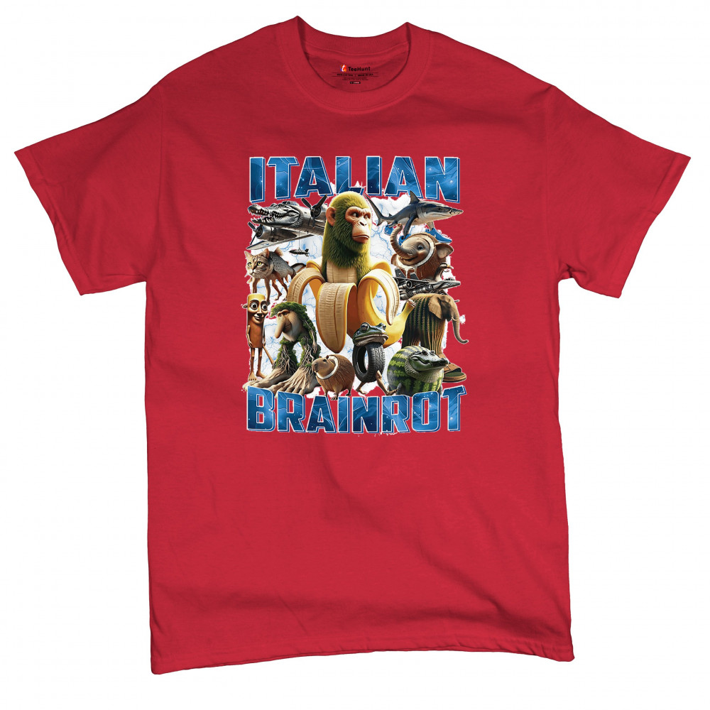 This design captures the full force of Italian brainrot—bananas, sharks, monkeys, and meme beasts collide in an unfiltered internet-core explosion. Perfect for fans of cursed humor, Gen Z trends, absurd fashion, TikTok memes, ironic style, surreal pop art, chaotic culture, digital nonsense, Gen Alpha brainrot, and hyper-online energy.