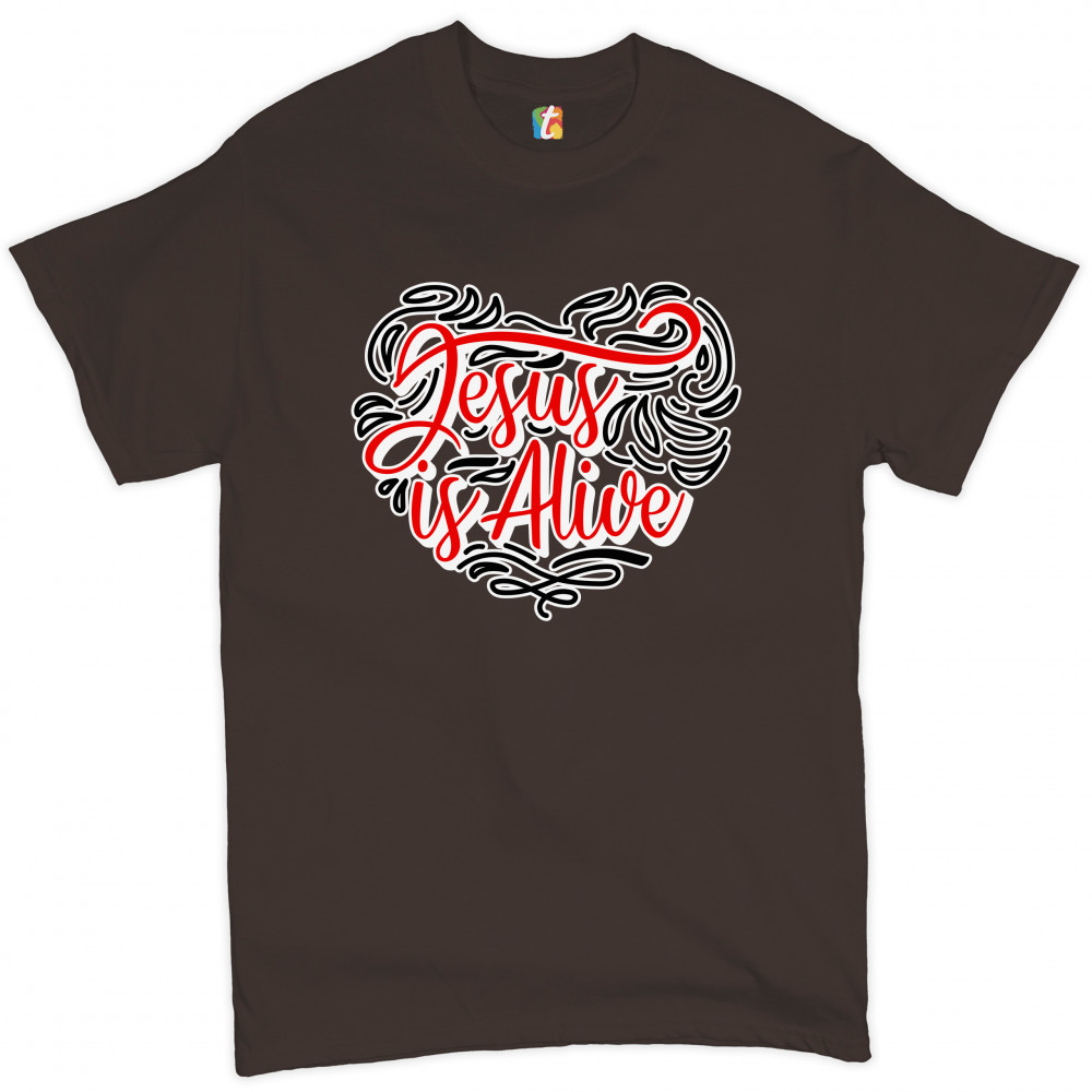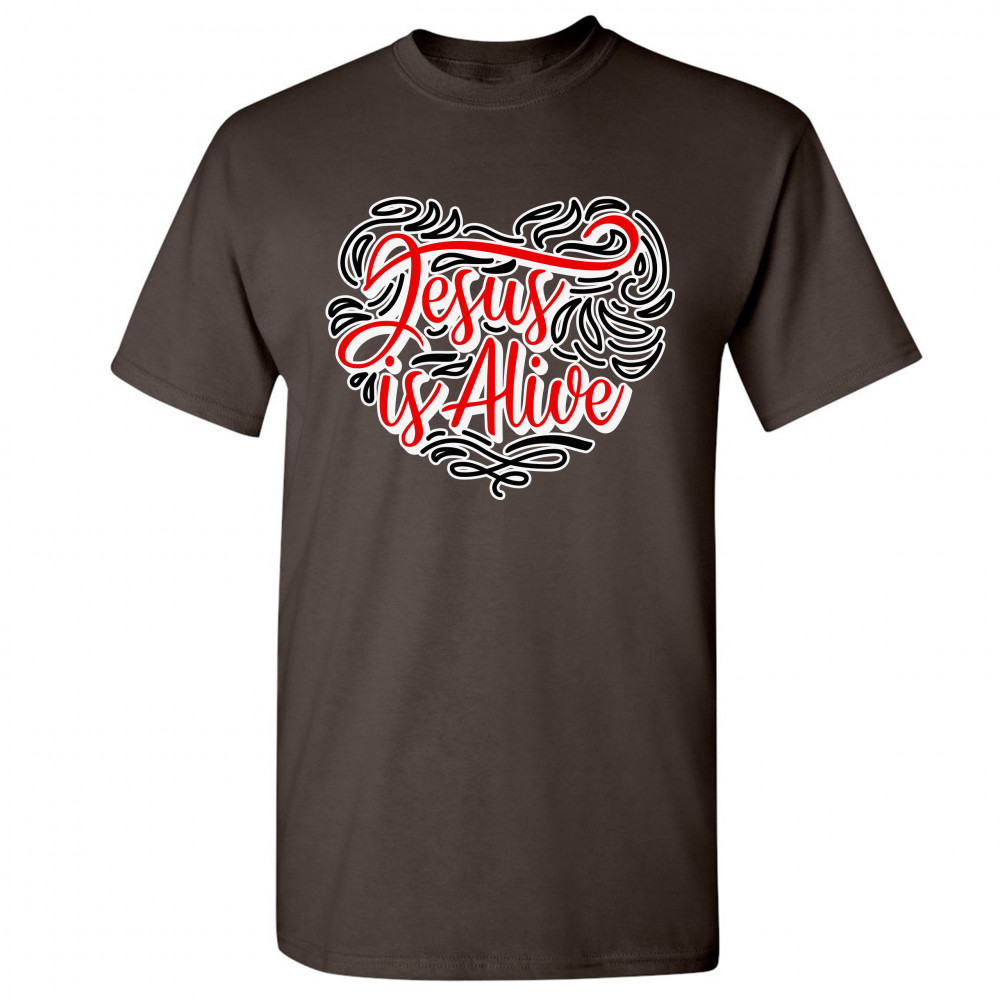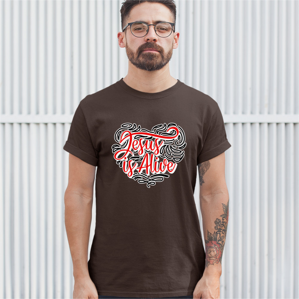 A print featuring a heart and the words "Jesus is alive" written above it. A great choice to wear on Easter to show your passion for Jesus Christ.