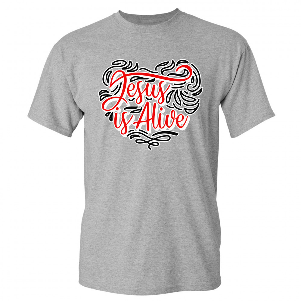 A print featuring a heart and the words "Jesus is alive" written above it. A great choice to wear on Easter to show your passion for Jesus Christ.