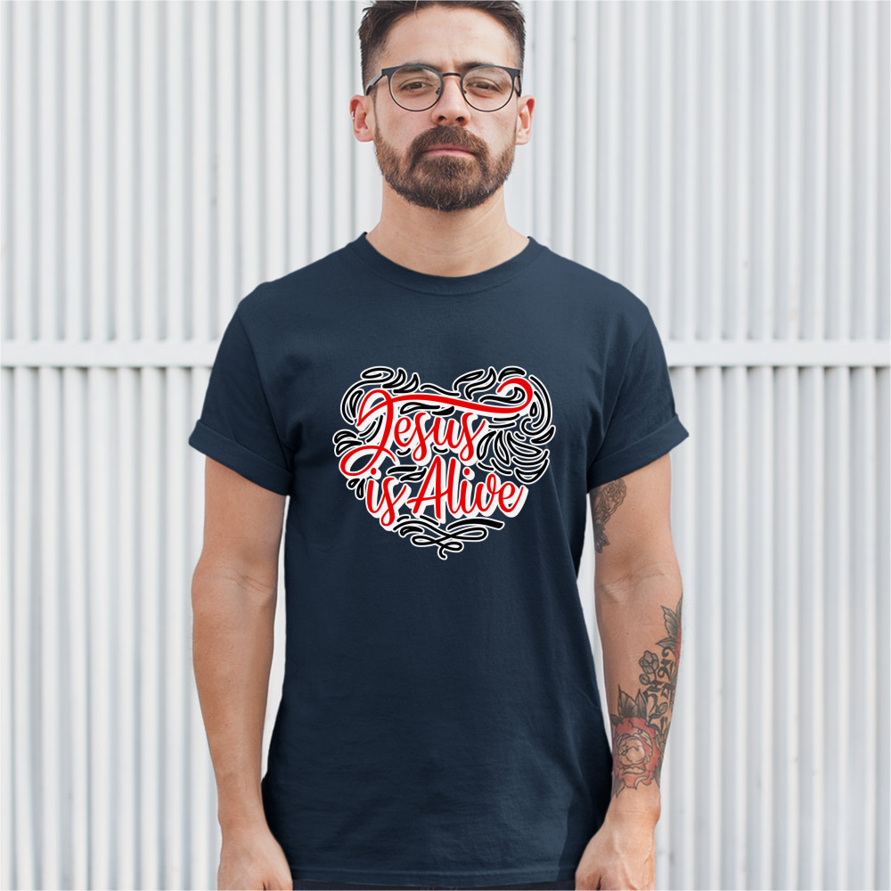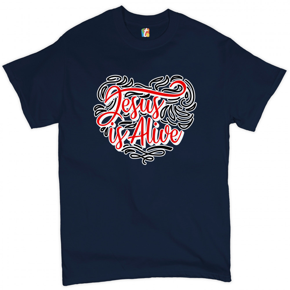 A print featuring a heart and the words "Jesus is alive" written above it. A great choice to wear on Easter to show your passion for Jesus Christ.