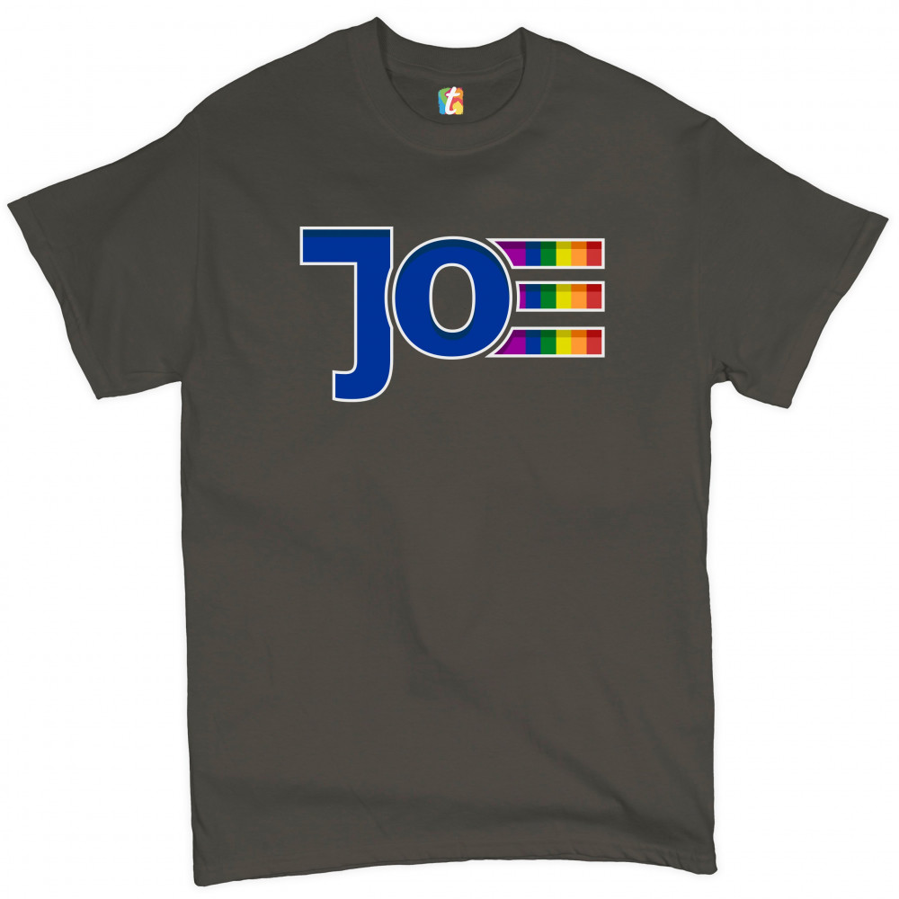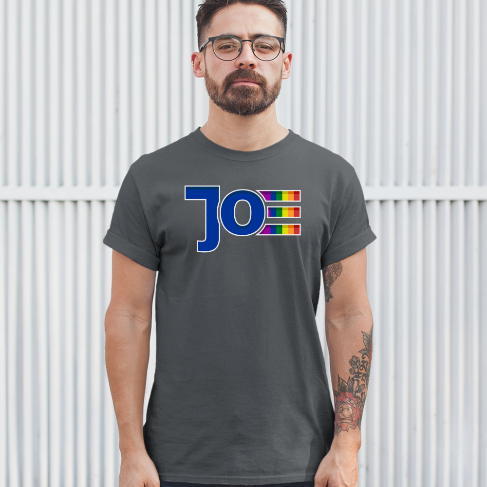 A political print featuring the name of the democratic presidential candidate "Joe". The letter "e" is painted with the colors of the lgbt rainbow. It is a great choice to wear to show your support for the democratic presidential nominee and his vice pres