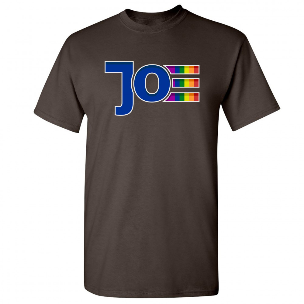 A political print featuring the name of the democratic presidential candidate "Joe". The letter "e" is painted with the colors of the lgbt rainbow. It is a great choice to wear to show your support for the democratic presidential nominee and his vice pres