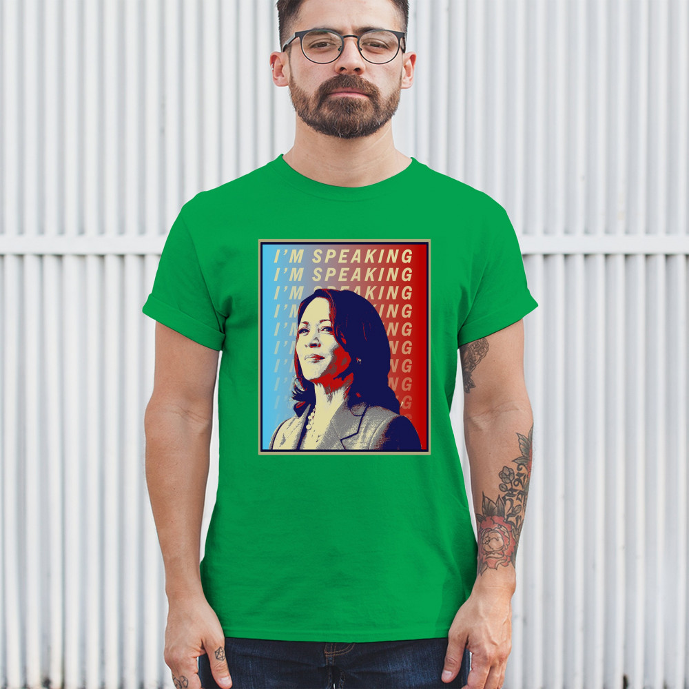 Support Kamala Harris with this bold and inspiring design. "I'M SPEAKING" echoes her powerful voice in the political arena, making it perfect for anti-Trump supporters, liberals, and Democrats. Crafted from durable materials, this design is comfortable for any event, from rallies to casual outings. Celebrate diversity and the historic candidacy of the potential first female president, resonating with black Americans, Hispanic Americans, LGBTQ supporters, and other minorities. Make a statement of hope and progress with this unique design.