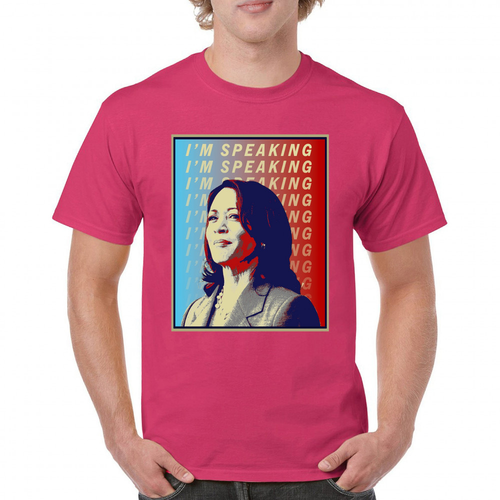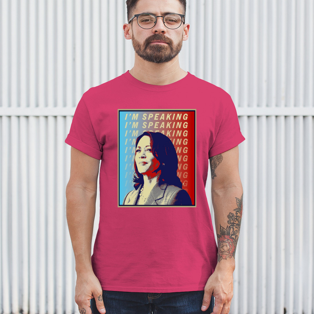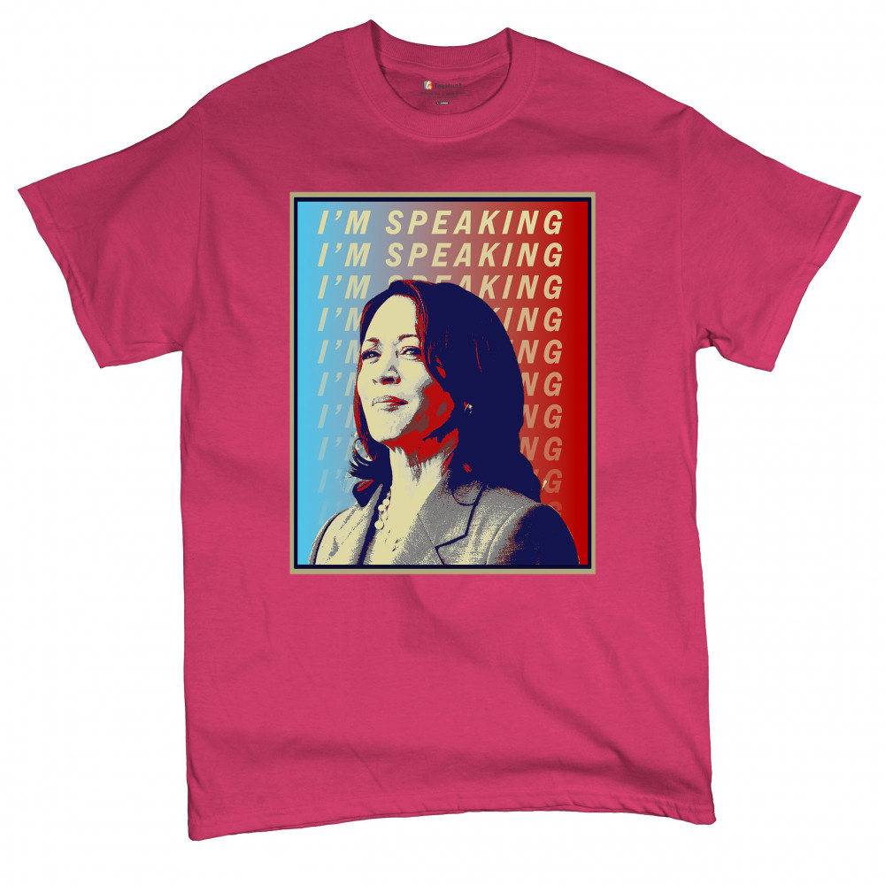 Support Kamala Harris with this bold and inspiring design. "I'M SPEAKING" echoes her powerful voice in the political arena, making it perfect for anti-Trump supporters, liberals, and Democrats. Crafted from durable materials, this design is comfortable for any event, from rallies to casual outings. Celebrate diversity and the historic candidacy of the potential first female president, resonating with black Americans, Hispanic Americans, LGBTQ supporters, and other minorities. Make a statement of hope and progress with this unique design.