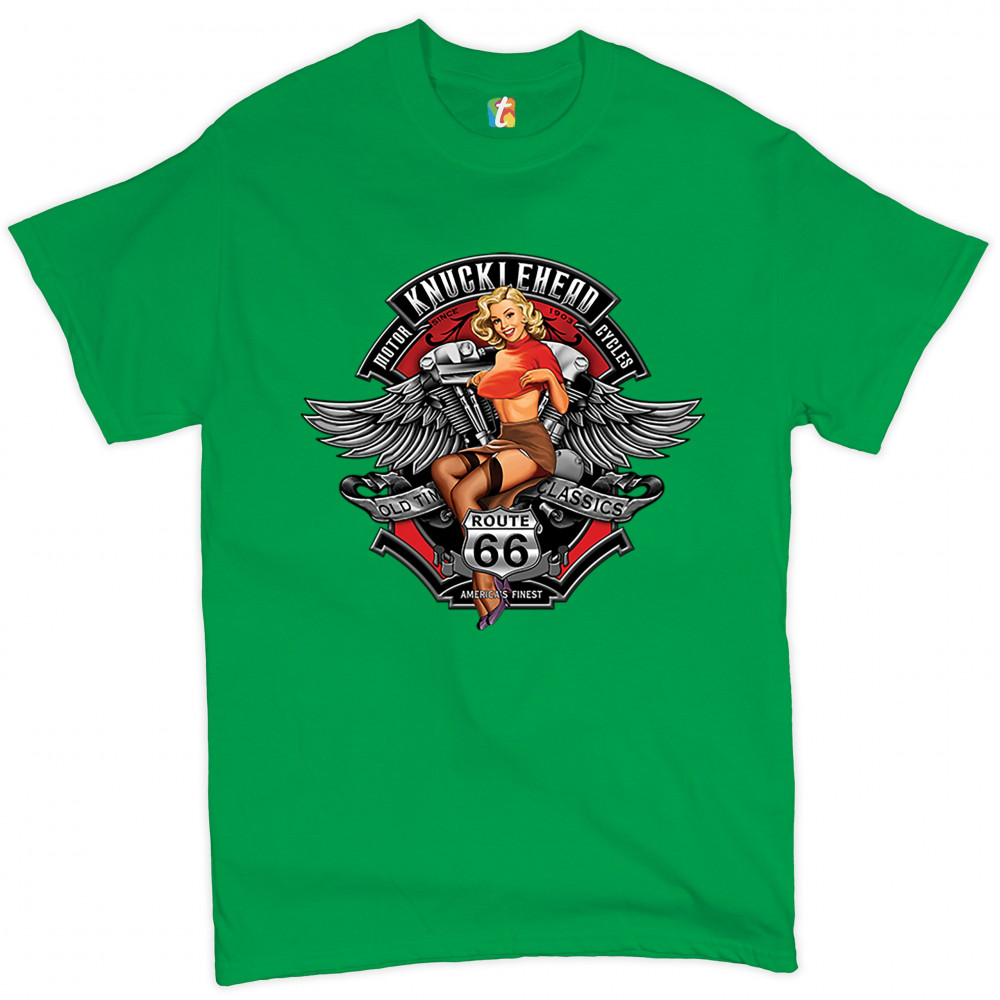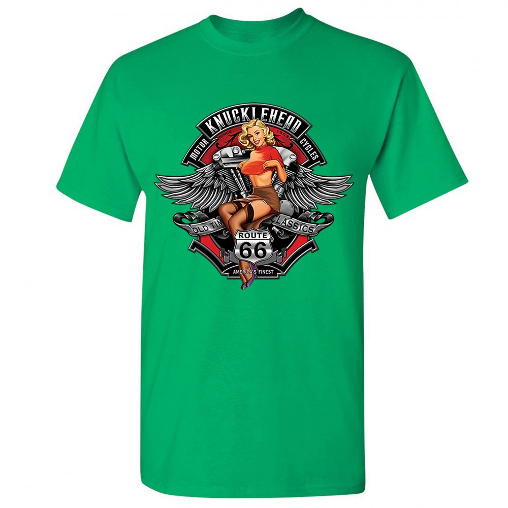A print featuring a sexy pin-up girl. In front of her legs there is a "Route 66" sign. In the background there is a motorcycle engine and wings behind it. The print says: "Knucklehead motorcycles since 1903. Old time classics. America's finest". A great c