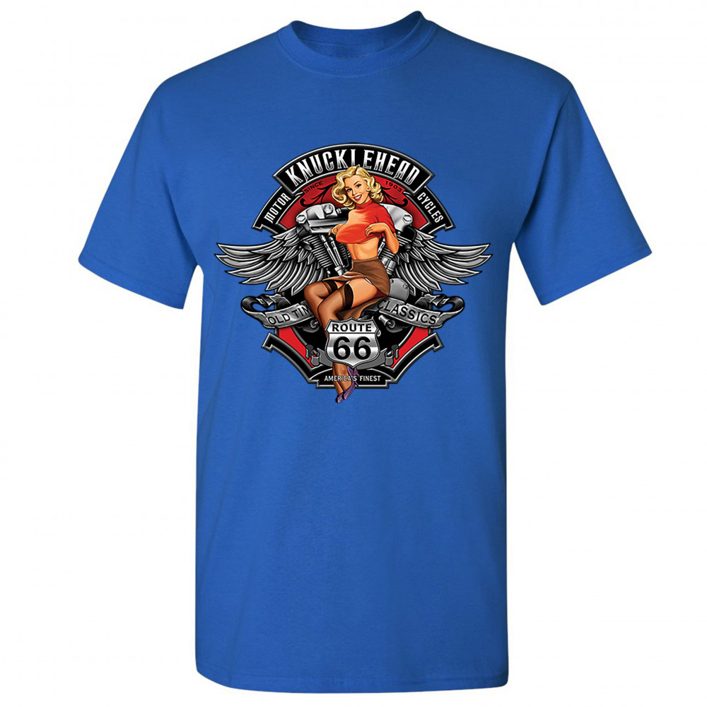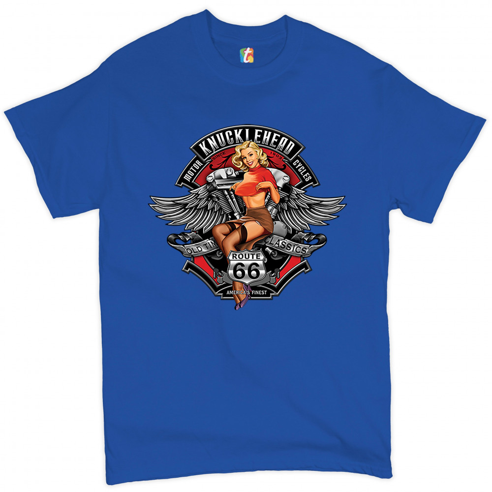 KNUCKLEHEAD MOTORCYCLES t-shirt old time classics pin-up girl biker men's tee royal blue