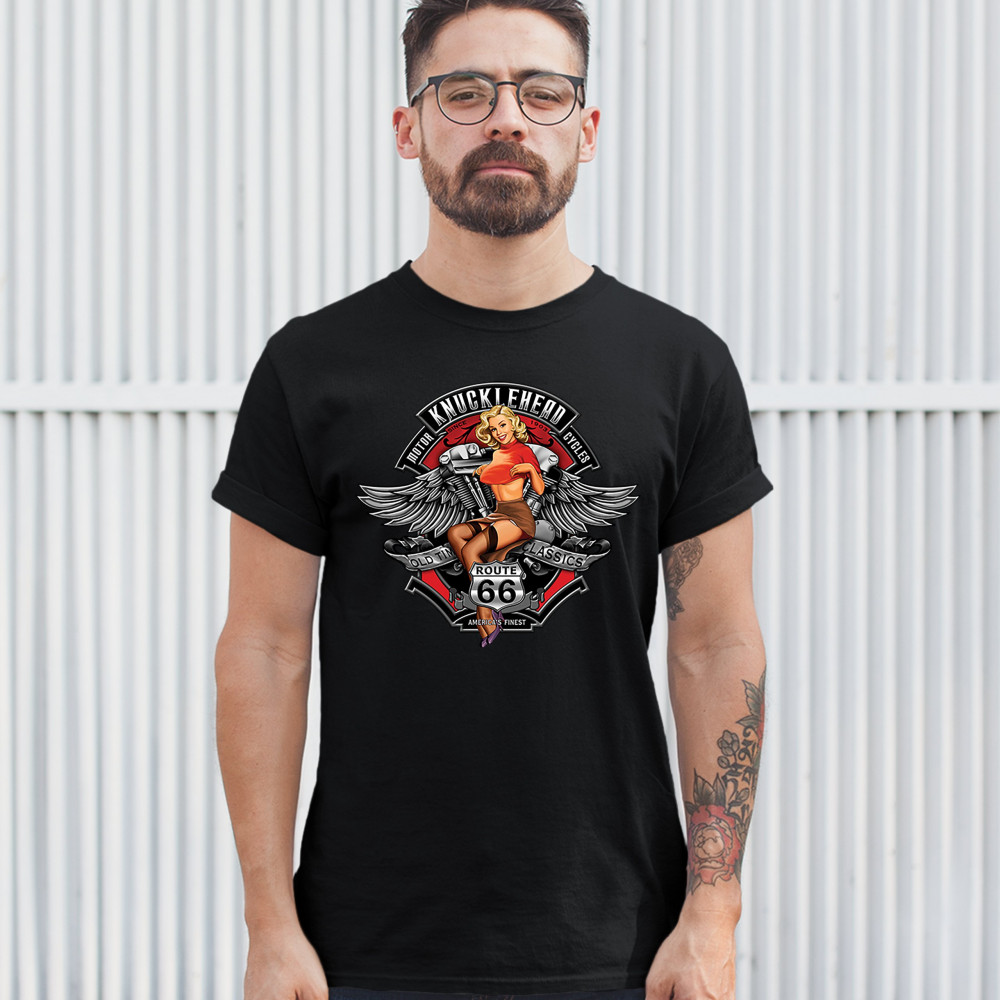 A print featuring a sexy pin-up girl. In front of her legs there is a "Route 66" sign. In the background there is a motorcycle engine and wings behind it. The print says: "Knucklehead motorcycles since 1903. Old time classics. America's finest". A great c