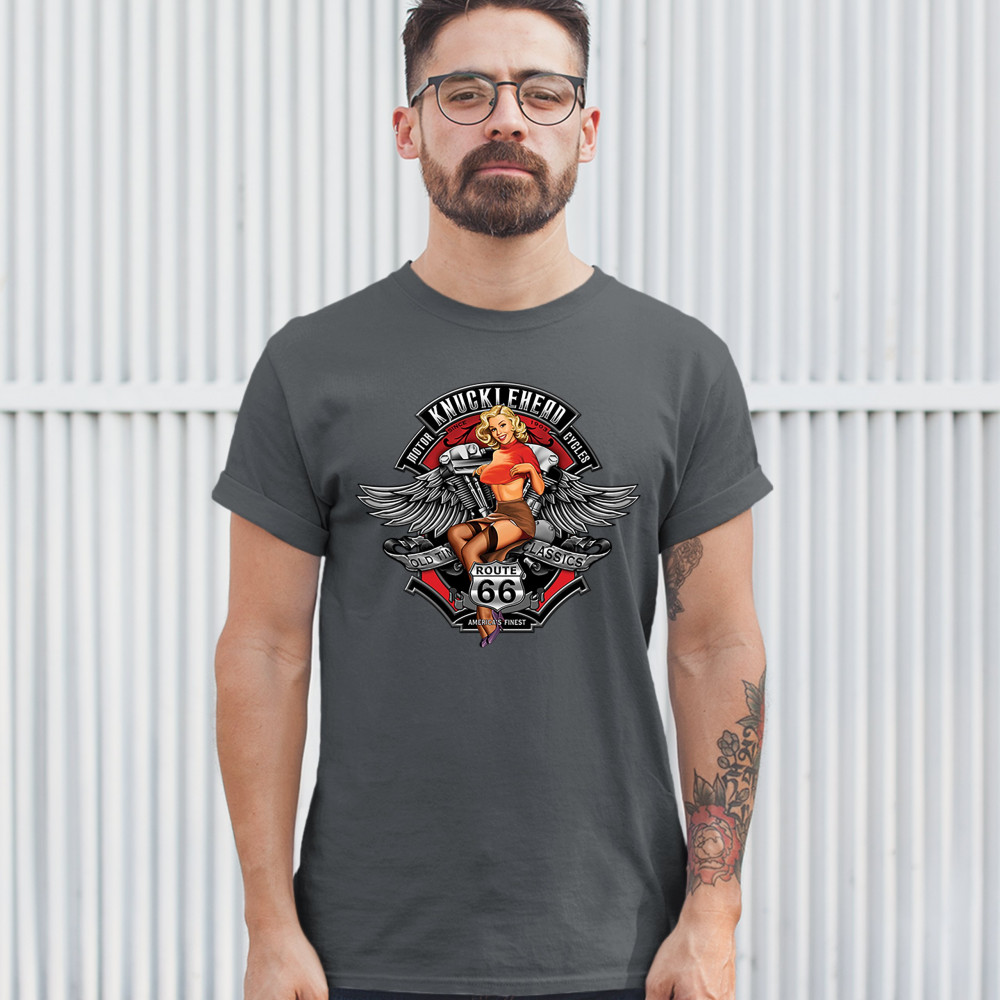 KNUCKLEHEAD MOTORCYCLES t-shirt old time classics pin-up girl biker men's tee charcoal