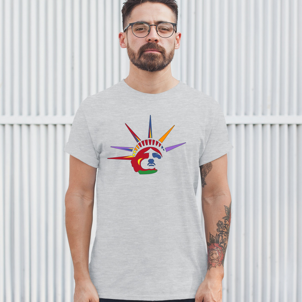 A patriotic print featuring a colorful face of the Statue of Liberty. Great choice to wear on Independence Day or any other patriotic holiday.