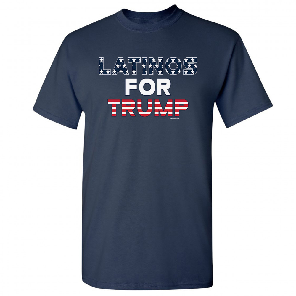 A political print saying "Latinos for Trump". The letters contain the Stars and Stripes of the American flag inside of them. A great choice to wear for a Trump rally or give as a gift to a Donald Trump and Mike Pence supporter before 2020 presidential elections.