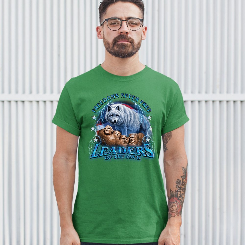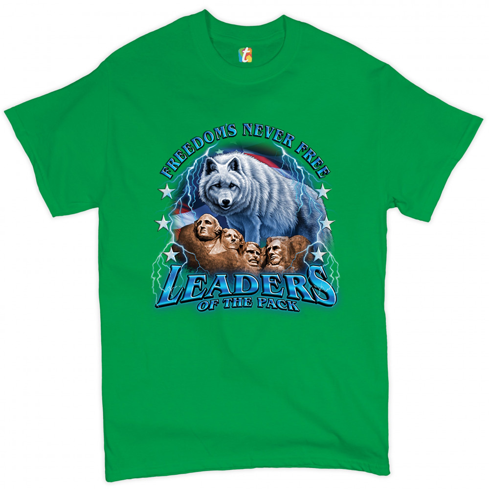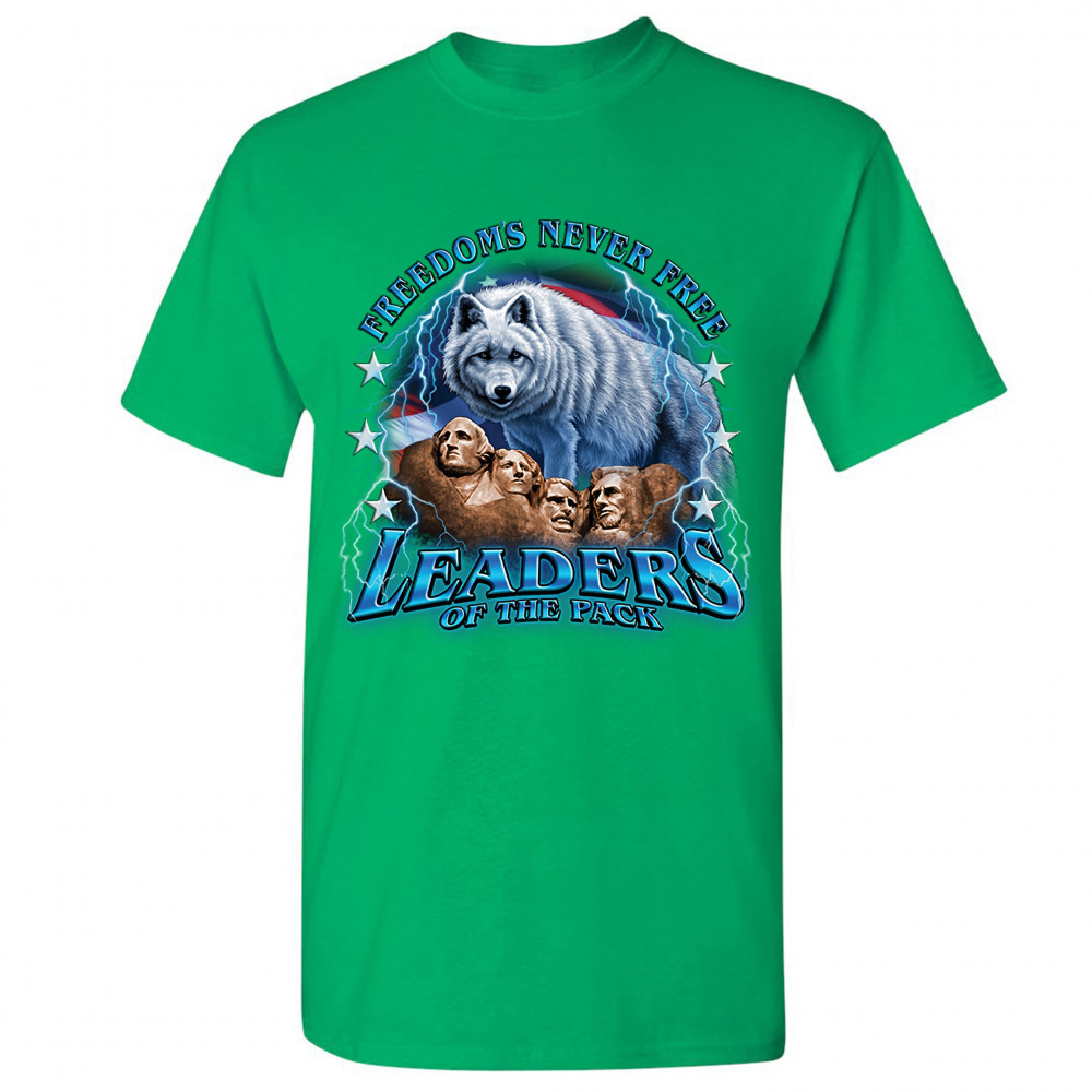 A patriotic print featuring the Mount Rushmore. There is a huge white wolf with the American flag in the background and lightning strikes all over the place. The print says: "Freedom's Never Free, Leaders of the Pack". Great choice to wear on Independence