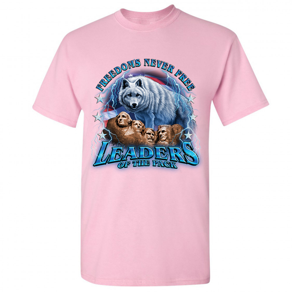 A patriotic print featuring the Mount Rushmore. There is a huge white wolf with the American flag in the background and lightning strikes all over the place. The print says: "Freedom's Never Free, Leaders of the Pack". Great choice to wear on Independence
