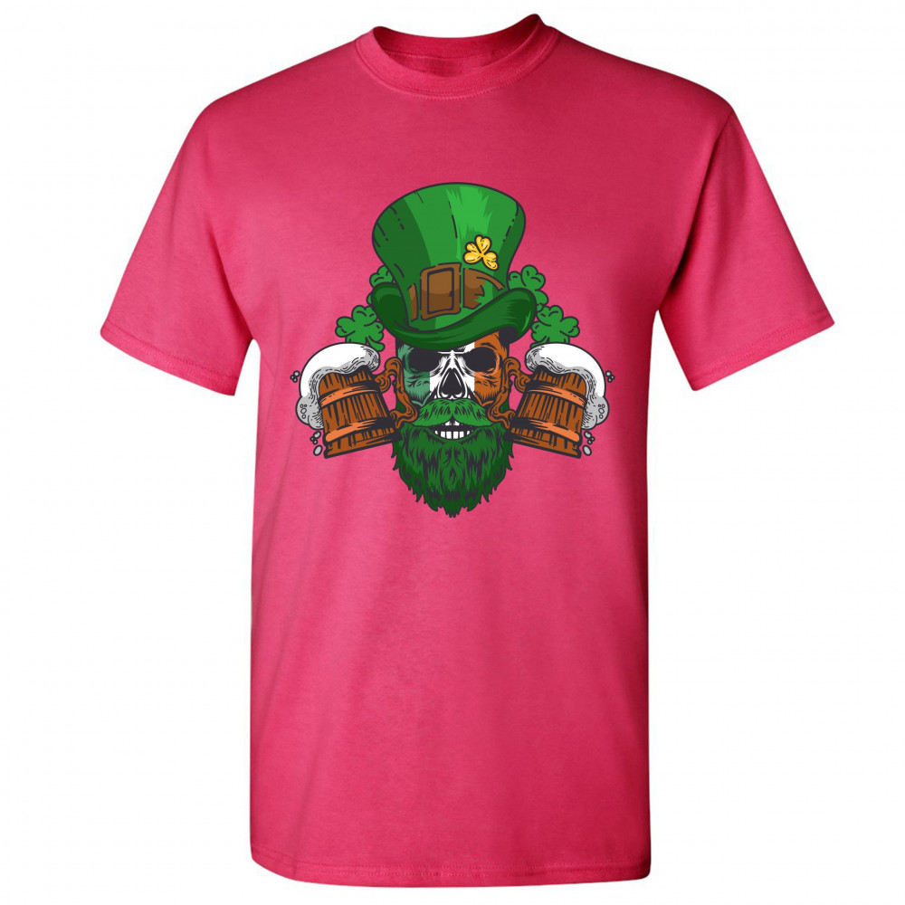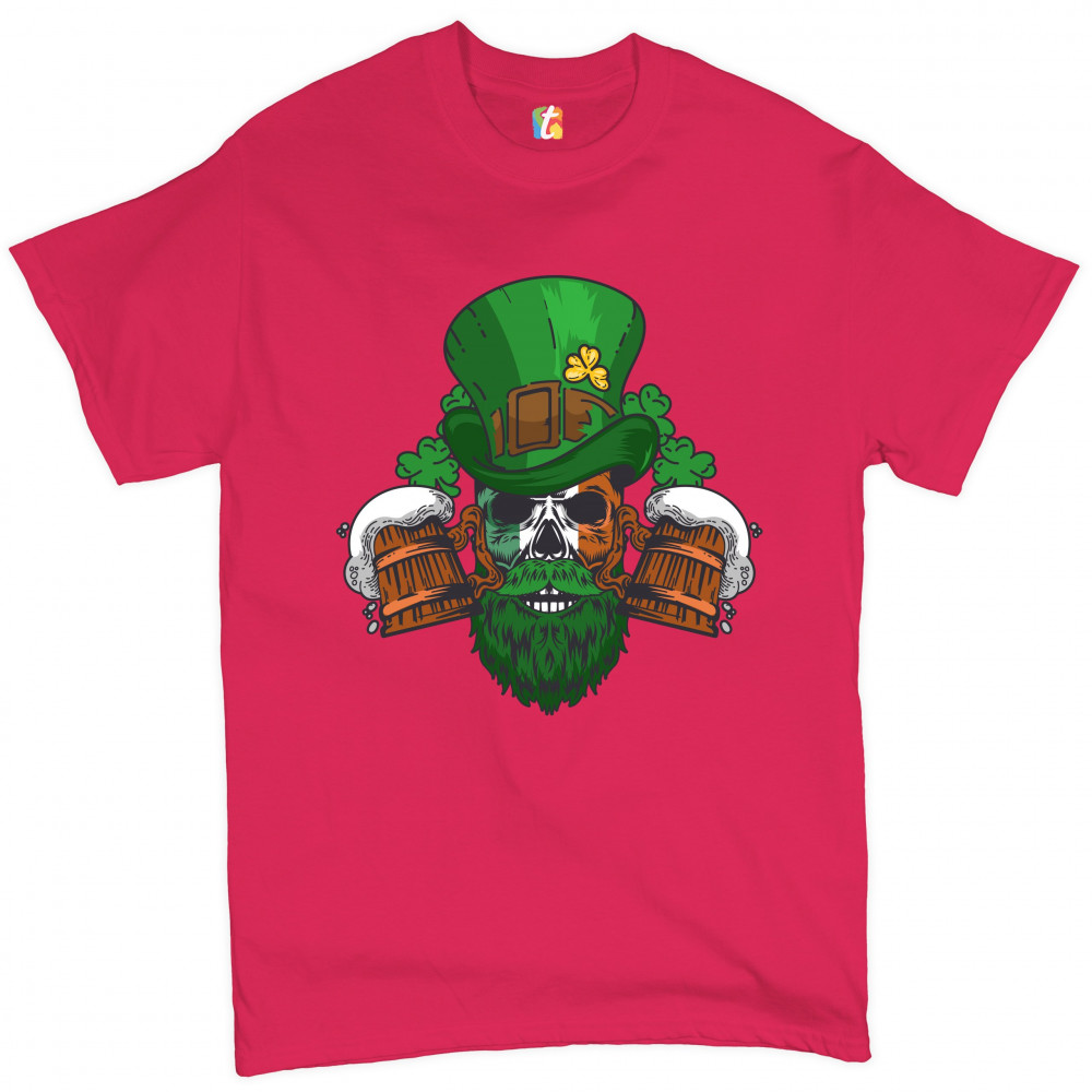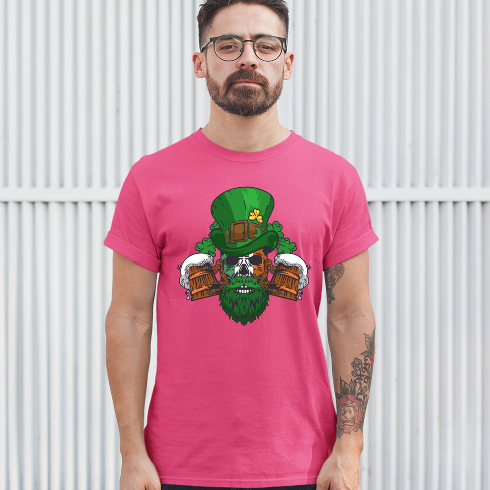 A print featuring a skull with green beard and Irish flag face. The skull is wearing a leprechaun hat. There are two beer mugs and numerous shamrocks around the skull. A great choice to wear on March 17 to celebrate the St. Patrick's Day and showcase your