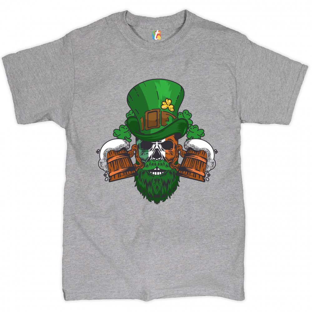 A print featuring a skull with green beard and Irish flag face. The skull is wearing a leprechaun hat. There are two beer mugs and numerous shamrocks around the skull. A great choice to wear on March 17 to celebrate the St. Patrick's Day and showcase your