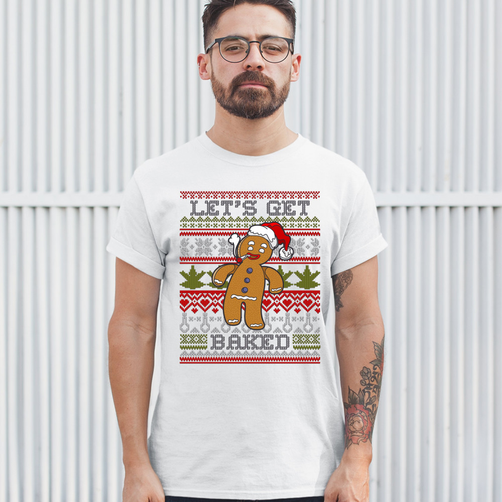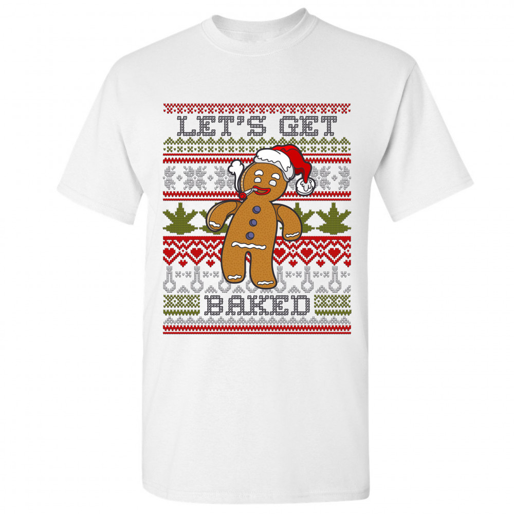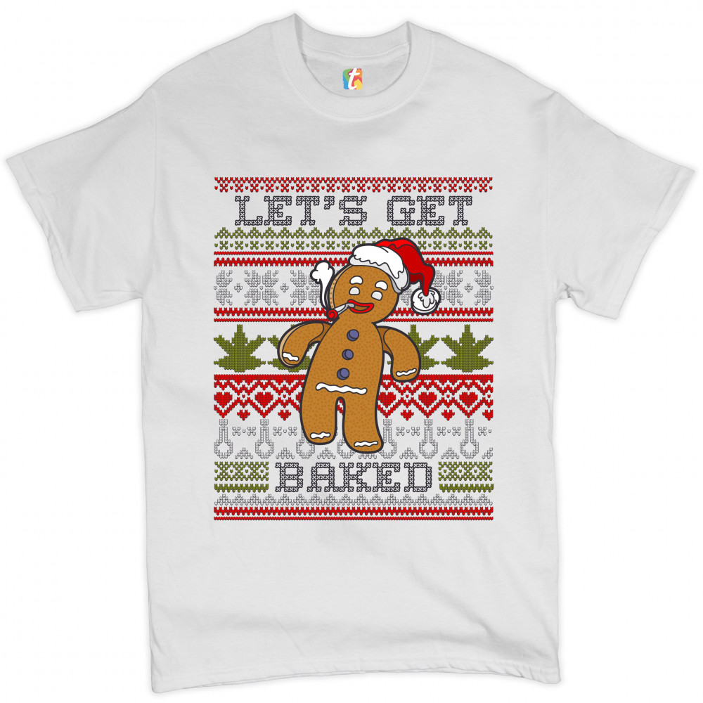 LET'S GET BAKED t-shirt ugly sweater gingerbread man 420 marijuana men's tee white