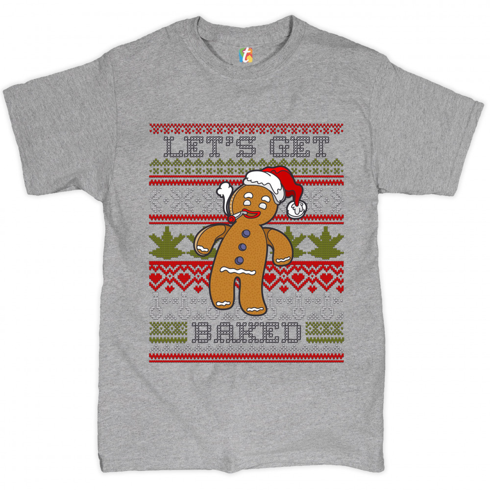 LET'S GET BAKED t-shirt ugly sweater gingerbread man 420 marijuana men's tee gray