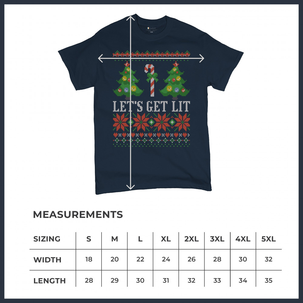 A print saying: "Let's Get Lit" and depicting two Christmas trees and a candy cane between them. The print is decorated as an ugly sweater. A great choice for a Christmas eve celebration.