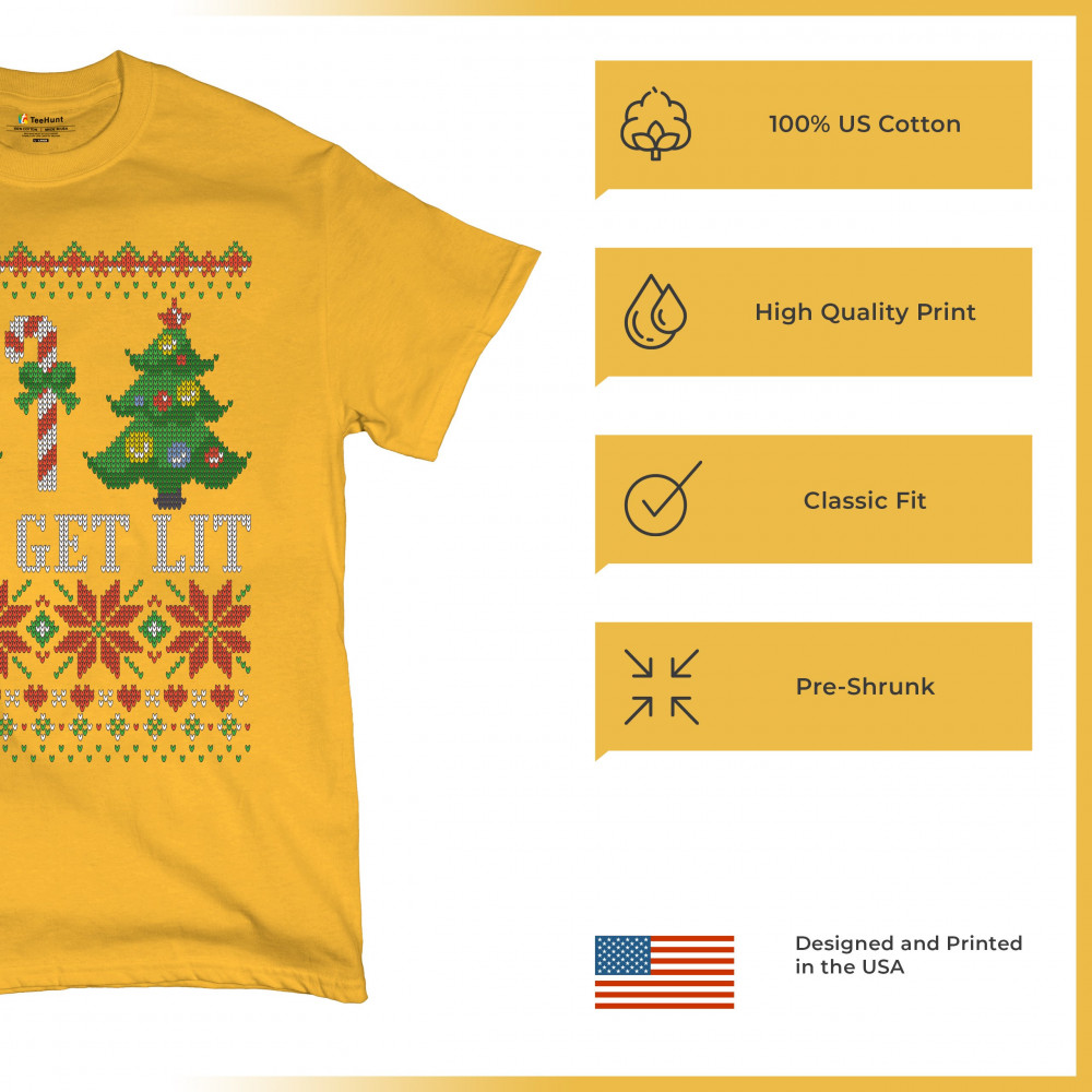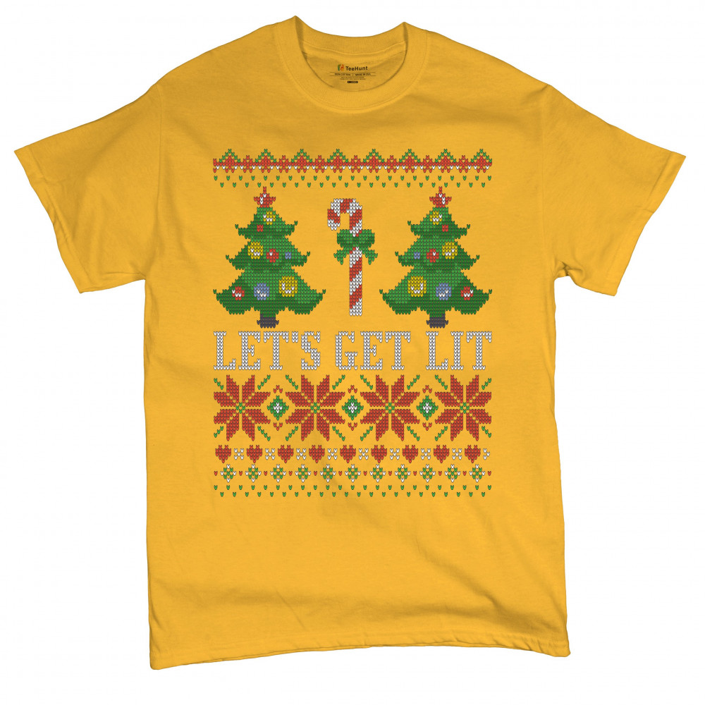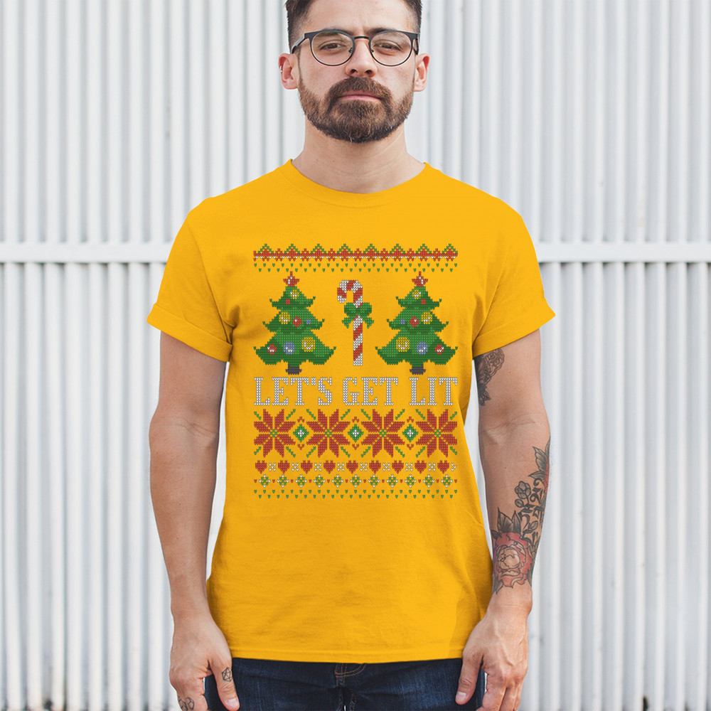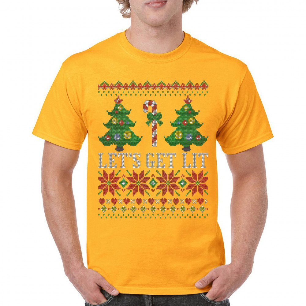 LET'S GET LIT t-shirt ugly sweater merry christmas candy cane men's tee yellow