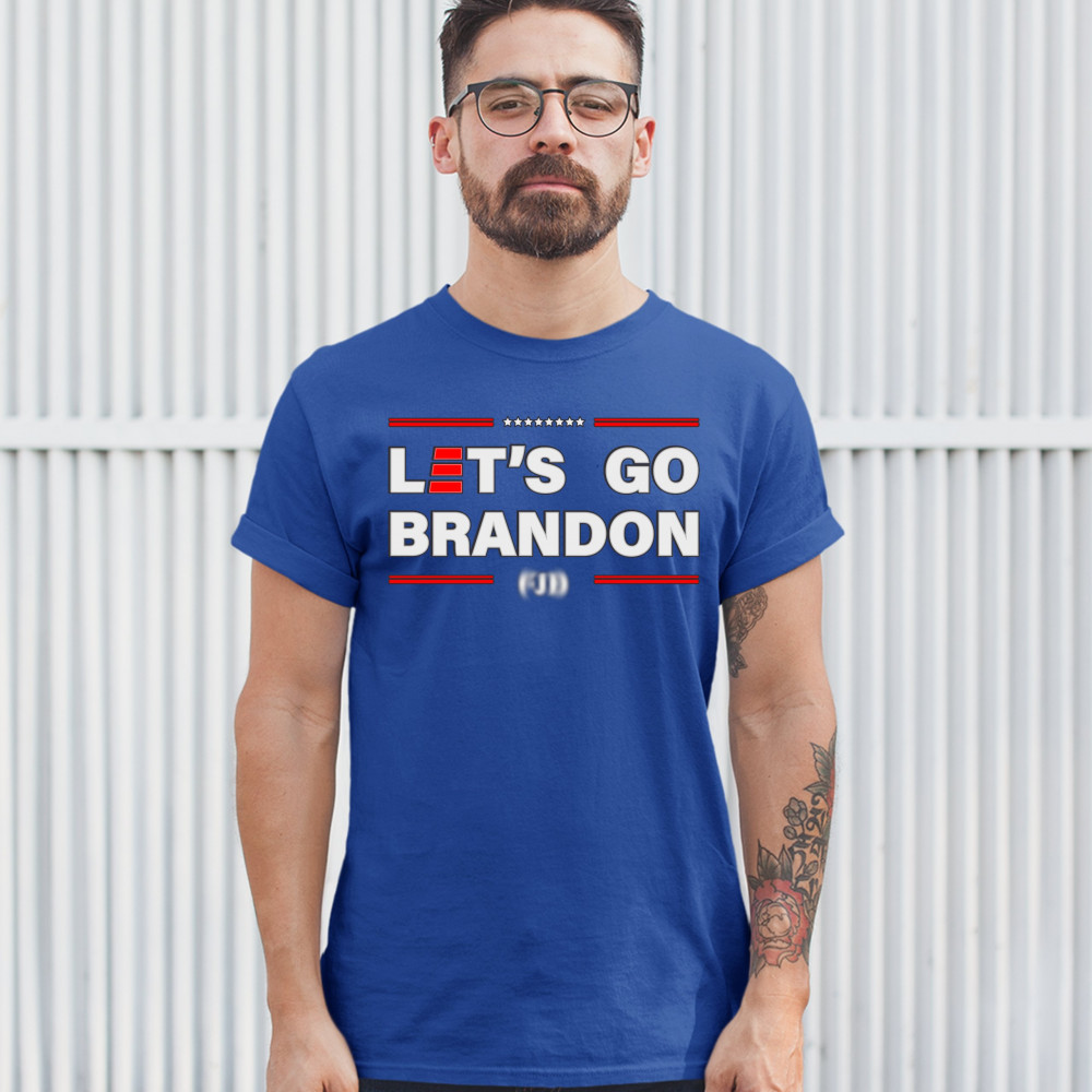 A funny political print saying: "Let's Go Brandon FJB" and featuring several stripes and stars. A great choice to wear for a Trump rally or an anti Biden protest!