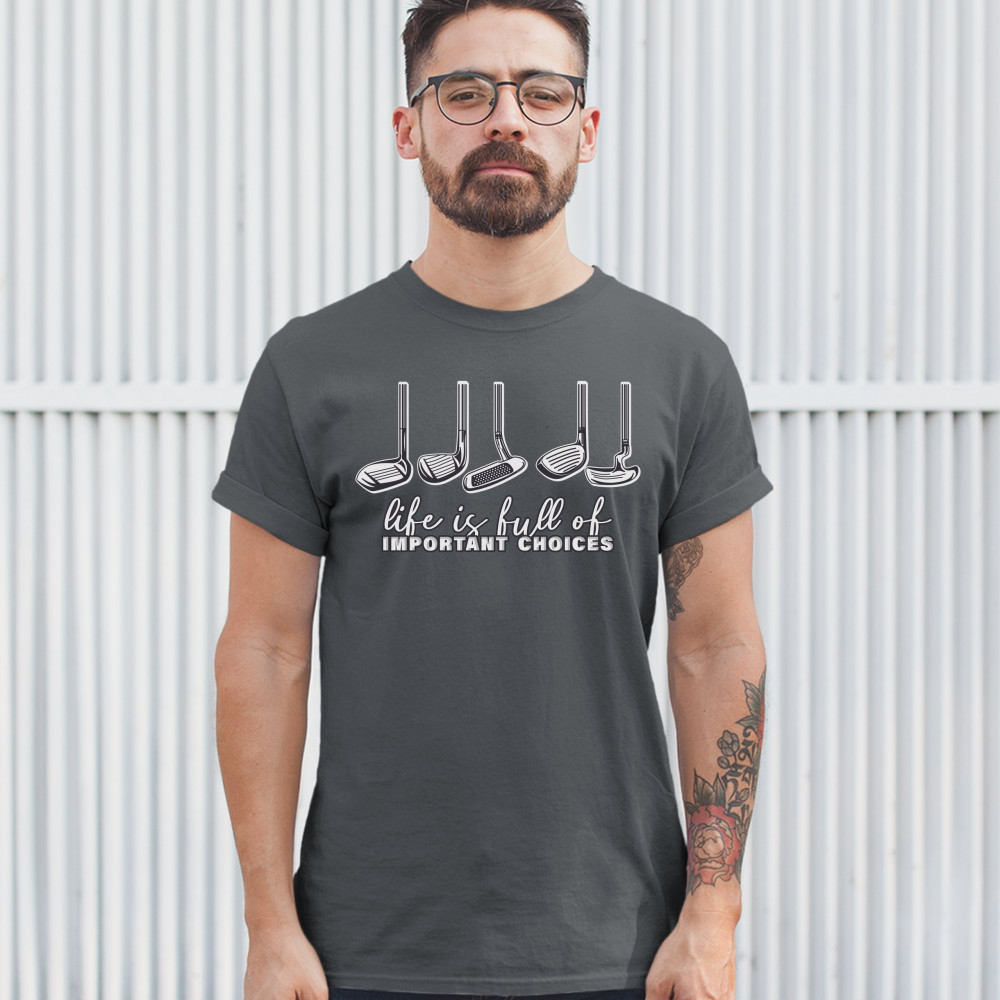 LIFE IS FULL OF IMPORTANT CHOICES t-shirt funny golf clubs golfing men's tee charcoal