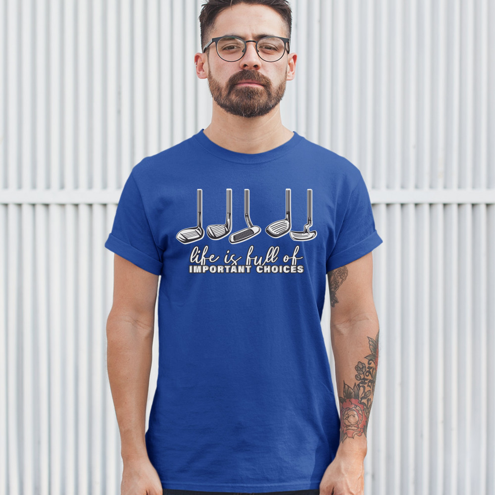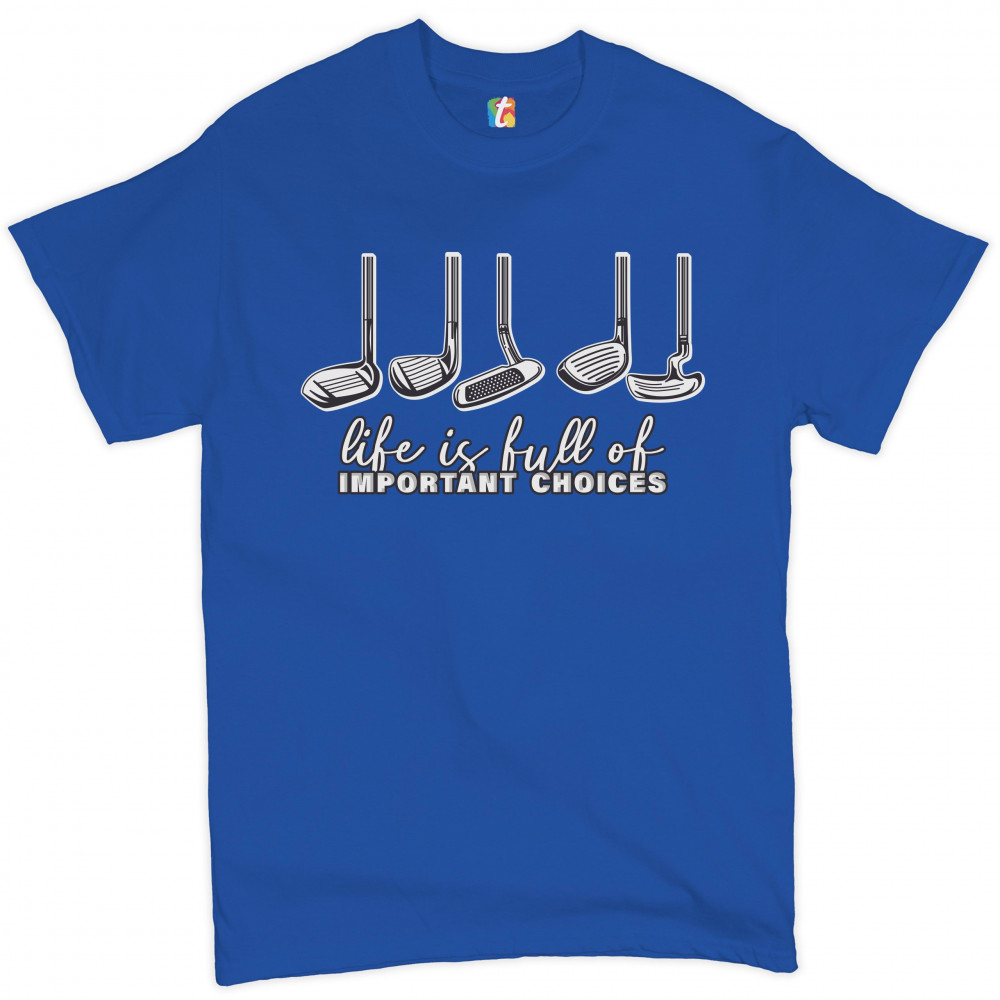 LIFE IS FULL OF IMPORTANT CHOICES t-shirt funny golf clubs golfing men's tee royal blue