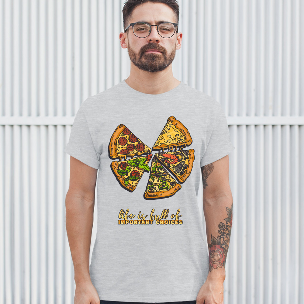 LIFE IS FULL OF IMPORTANT CHOICES t-shirt funny pepperoni pizza men's tee ash gray