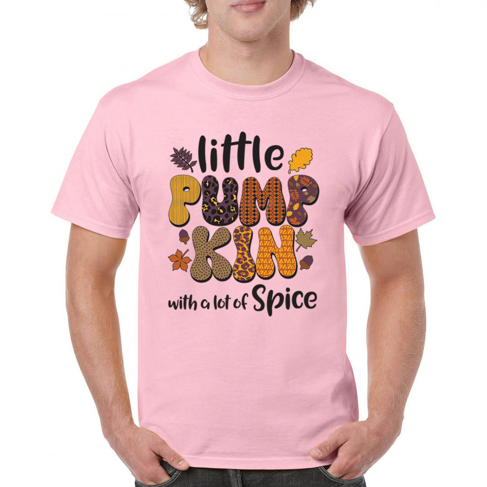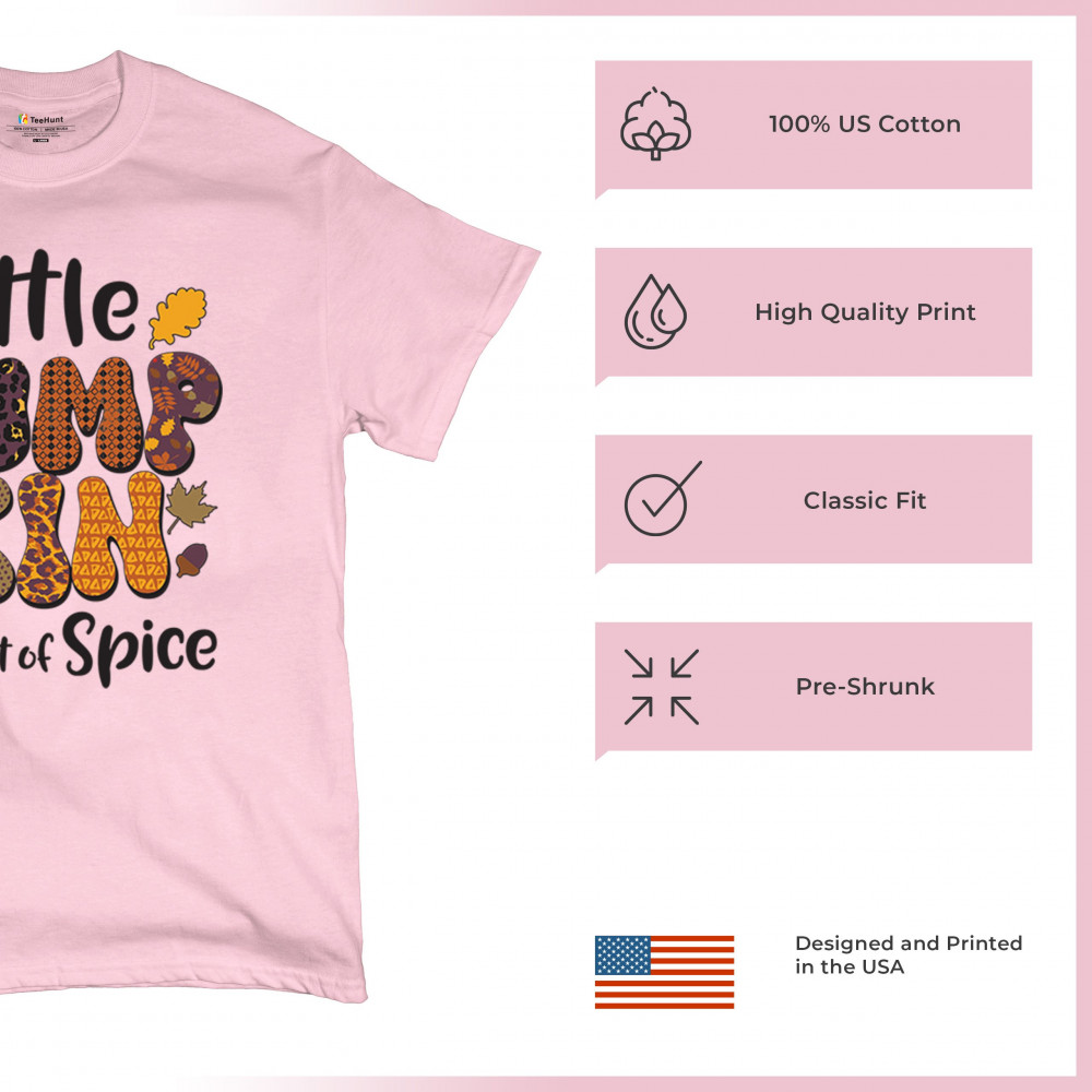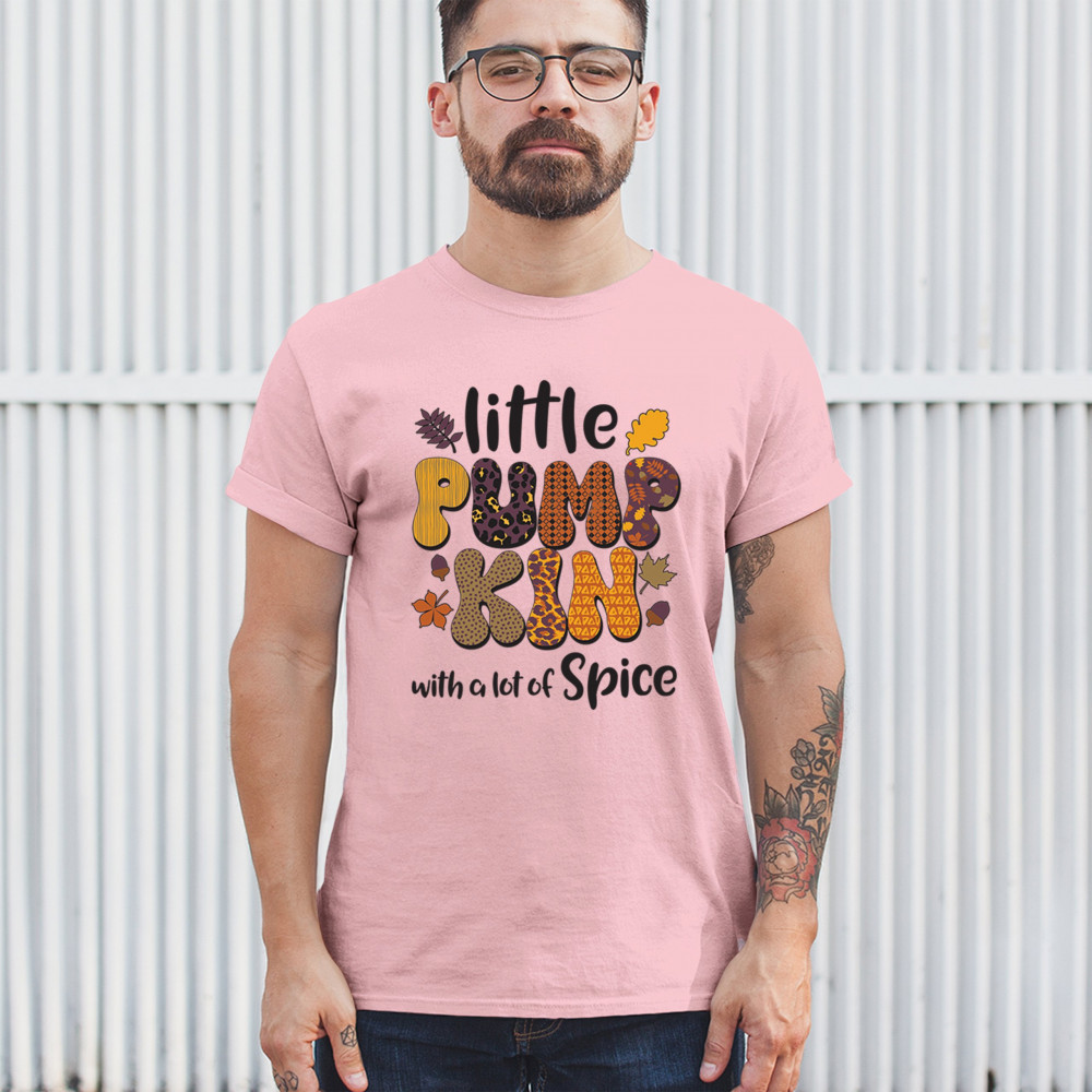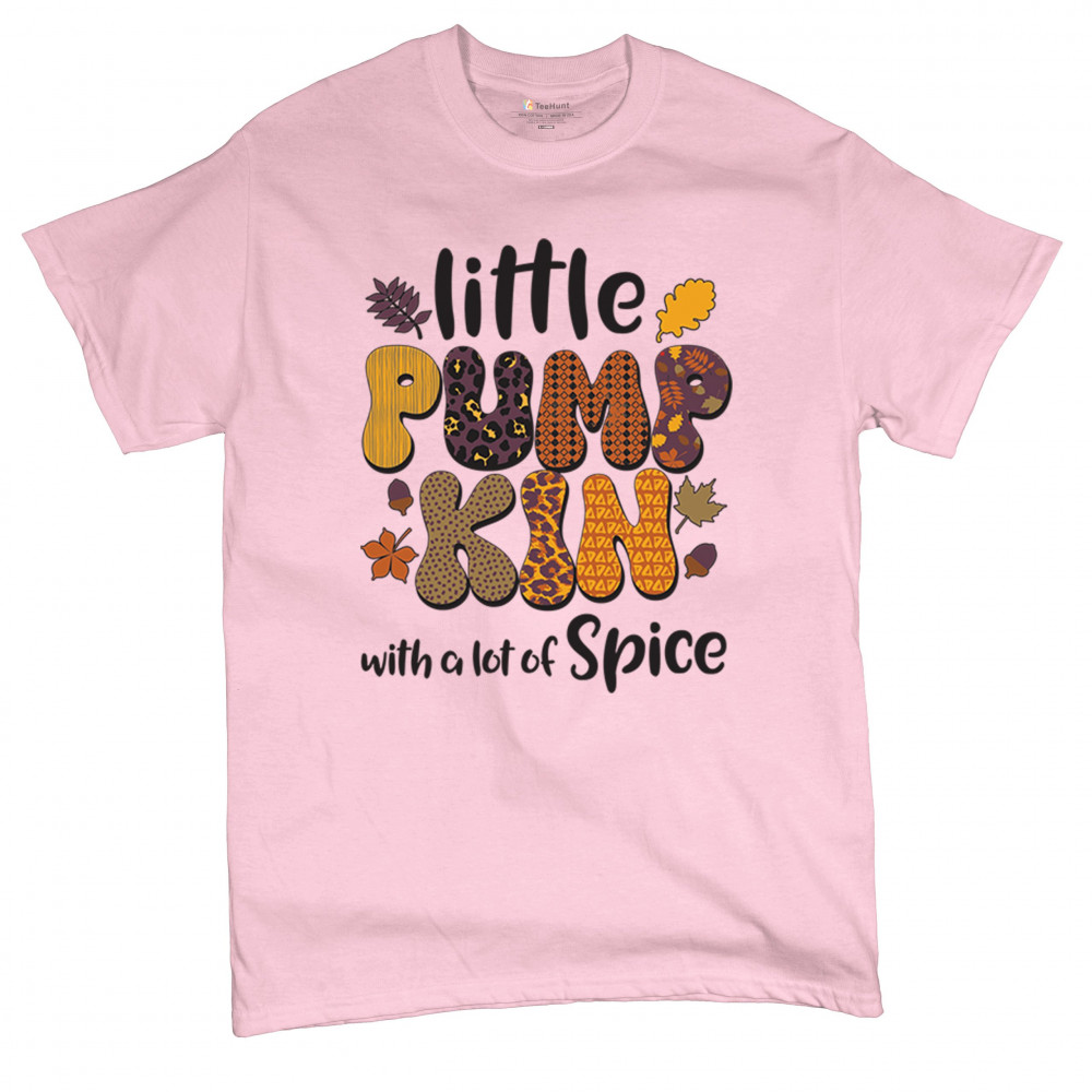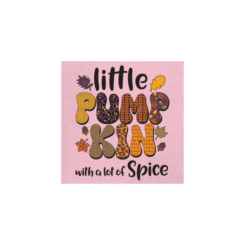 Celebrate the fall season with this playful 'Little Pumpkin with a Lot of Spice' design, perfect for festive gatherings and pumpkin patch visits.