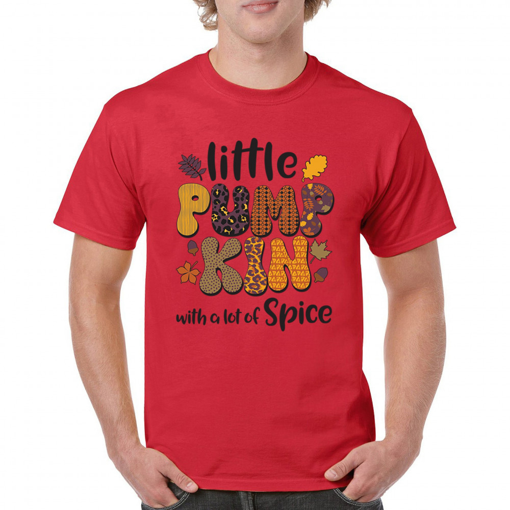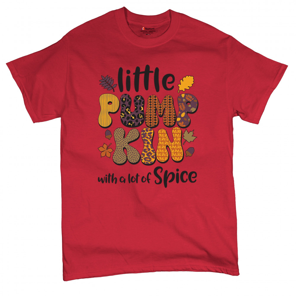 Celebrate the fall season with this playful 'Little Pumpkin with a Lot of Spice' design, perfect for festive gatherings and pumpkin patch visits.