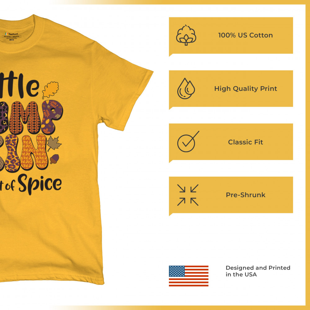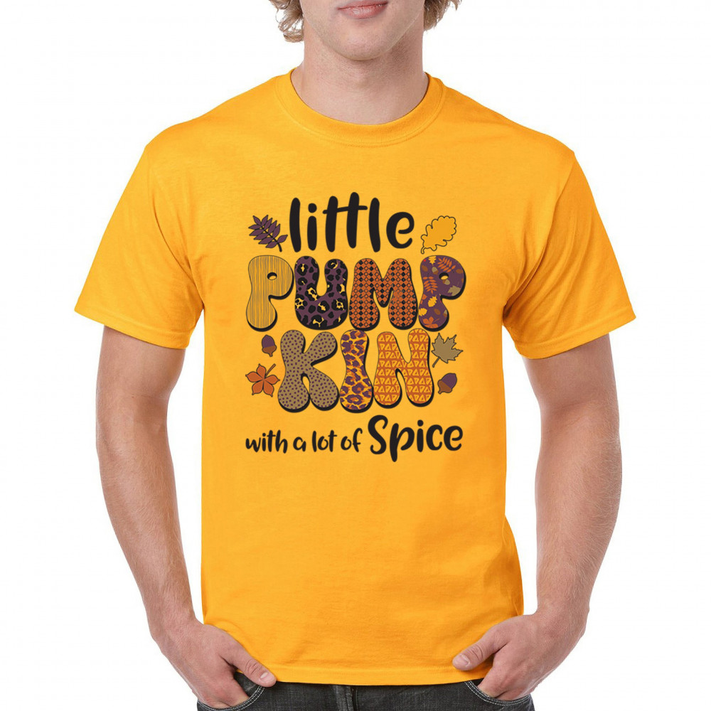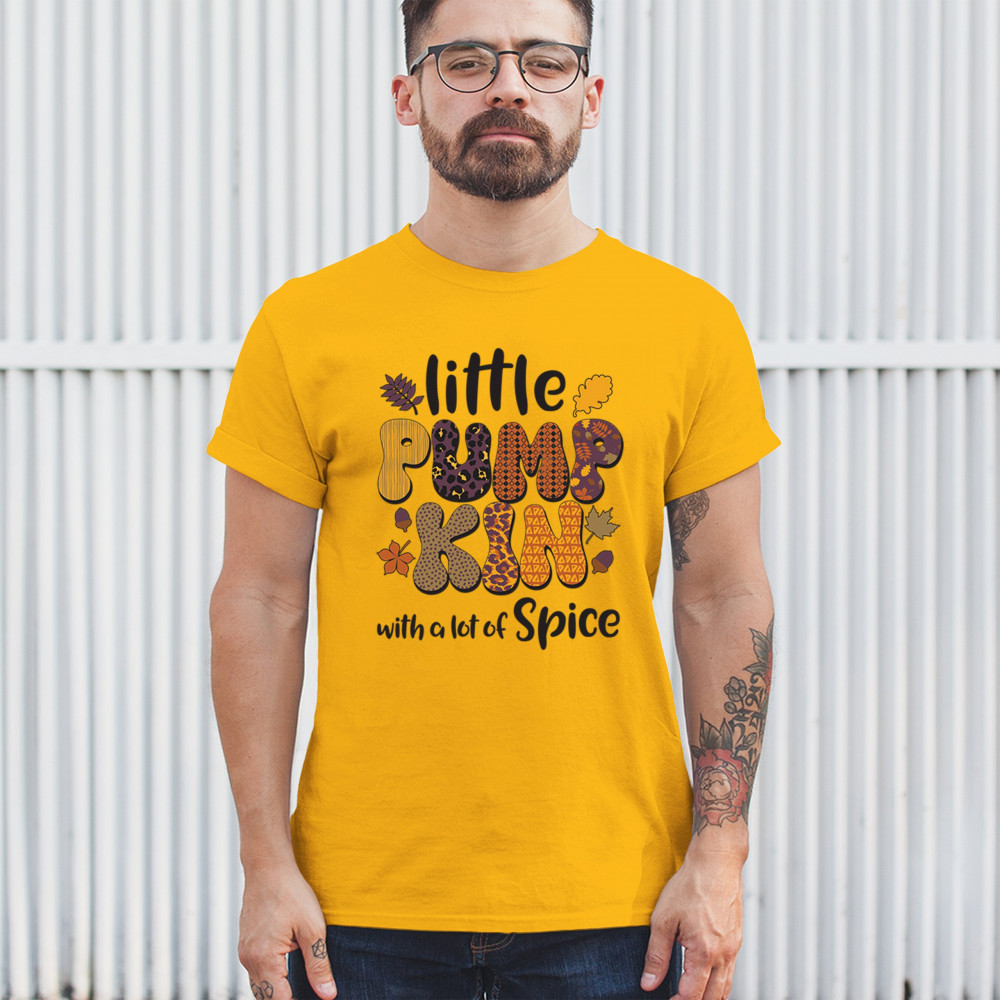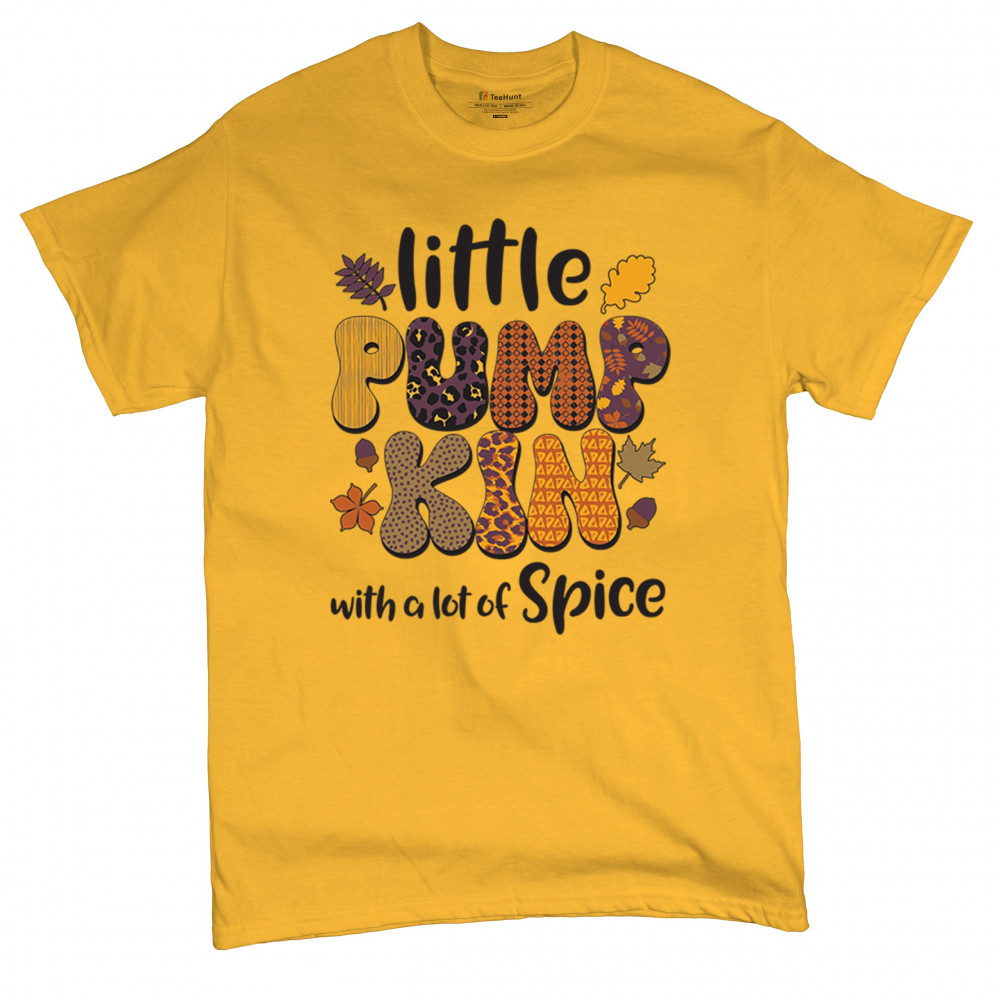 Celebrate the fall season with this playful 'Little Pumpkin with a Lot of Spice' design, perfect for festive gatherings and pumpkin patch visits.