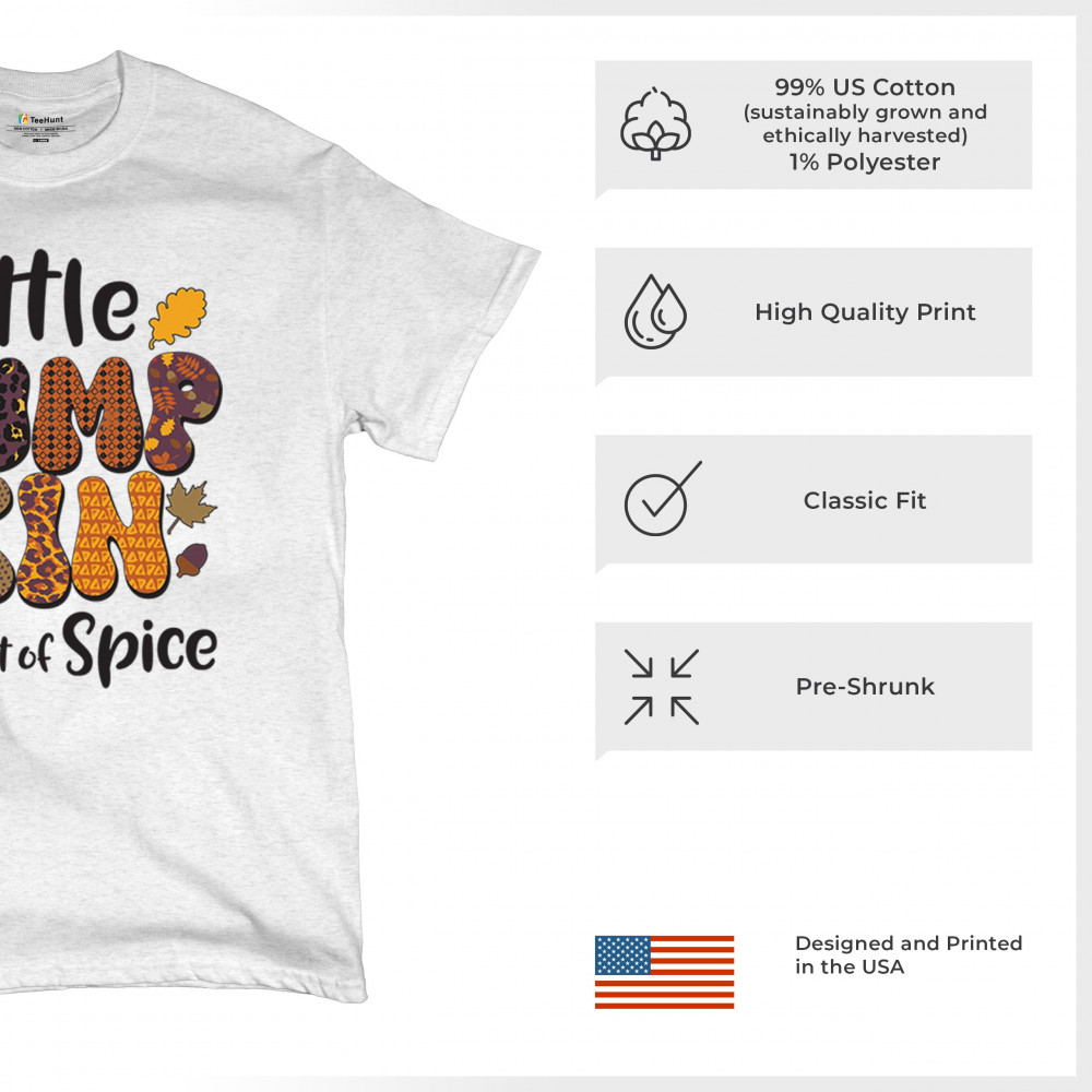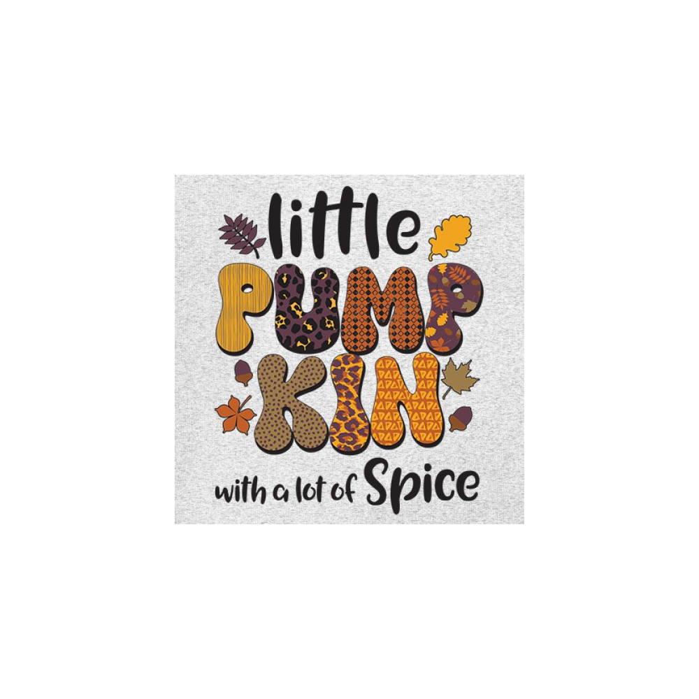 Celebrate the fall season with this playful 'Little Pumpkin with a Lot of Spice' design, perfect for festive gatherings and pumpkin patch visits.