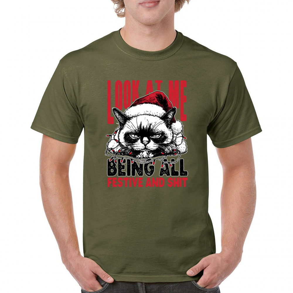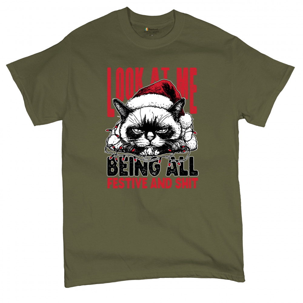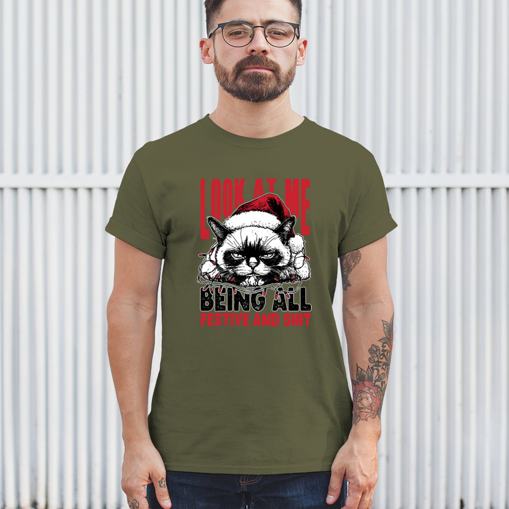 Grumpy Cat Christmas design with Santa hat, Christmas tree humor, Let It Snow vibes, Jingle Bells style, and sarcastic Merry Xmas spirit.