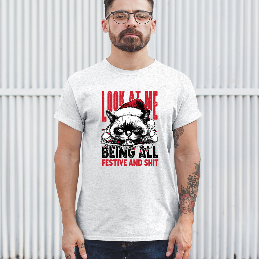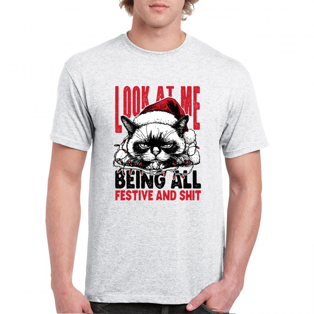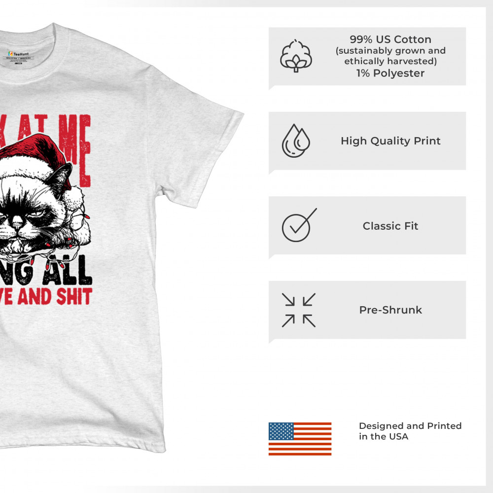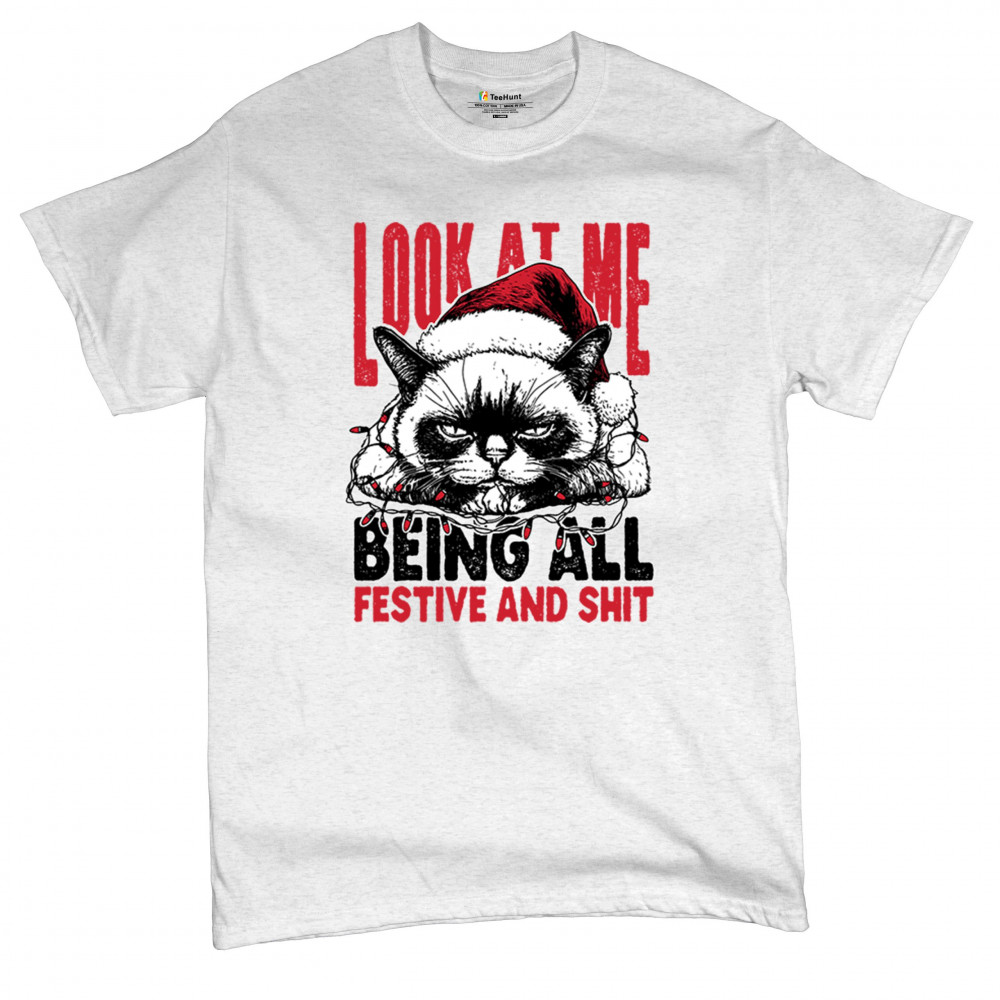 Grumpy Cat Christmas design with Santa hat, Christmas tree humor, Let It Snow vibes, Jingle Bells style, and sarcastic Merry Xmas spirit.